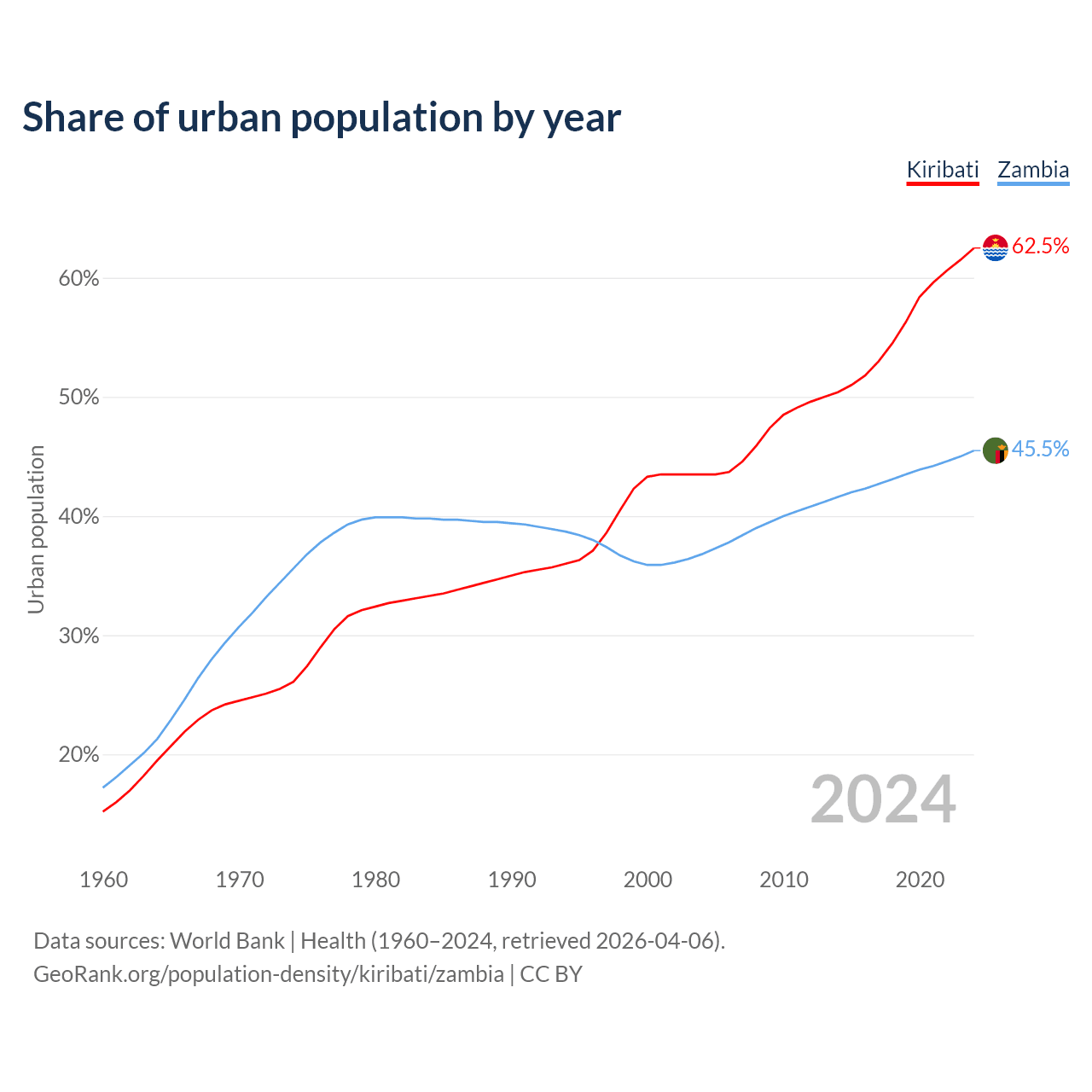 From 2004 to 2024, the share of urban population changed from 43.5% to 62.5% in Kiribati and from 36.8% to 45.5% in Zambia.