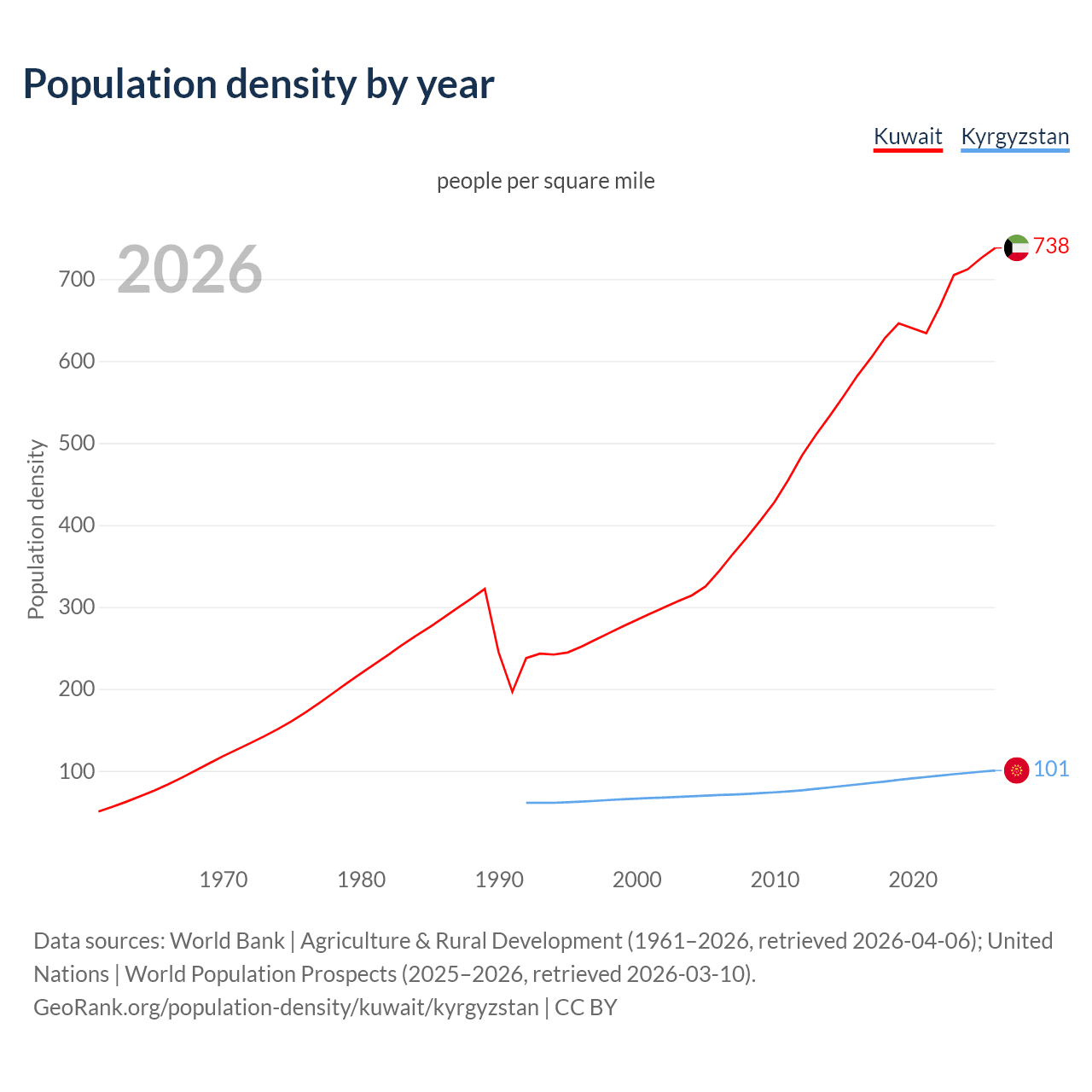 From 2006 to 2026, population density in Kuwait increased by 114.9%, compared to a 42.6% growth in Kyrgyzstan.