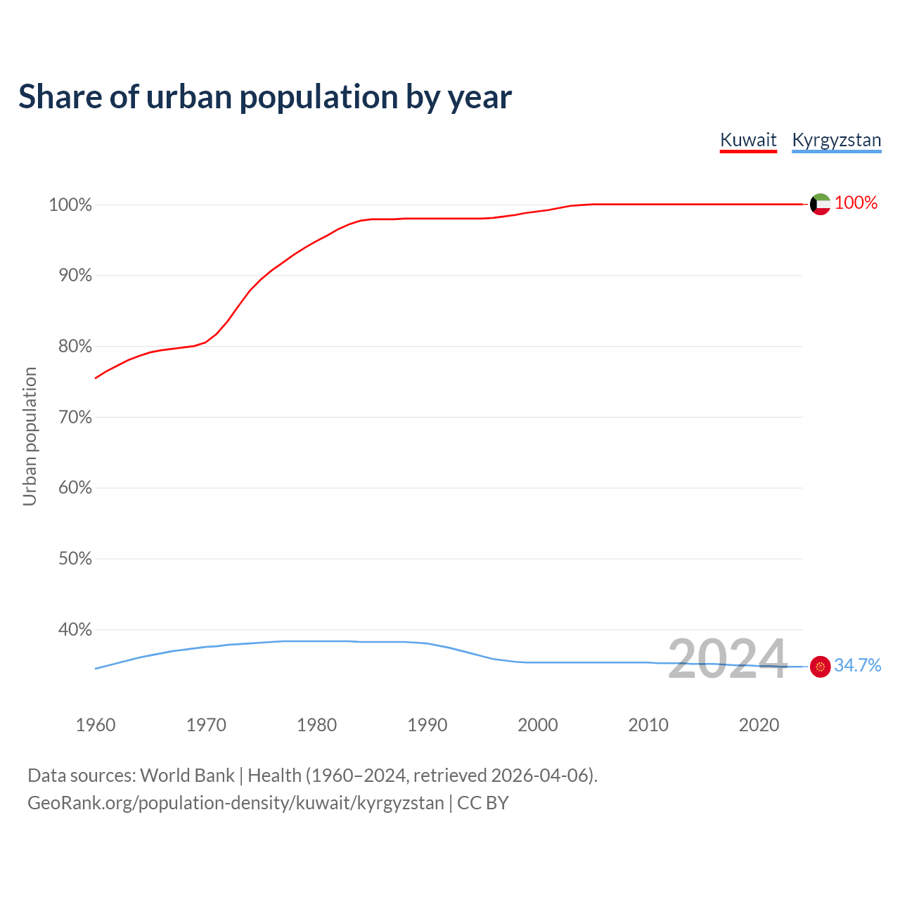 From 2004 to 2024, the share of urban population changed from 99.9% to 100% in Kuwait and from 35.3% to 34.7% in Kyrgyzstan.
