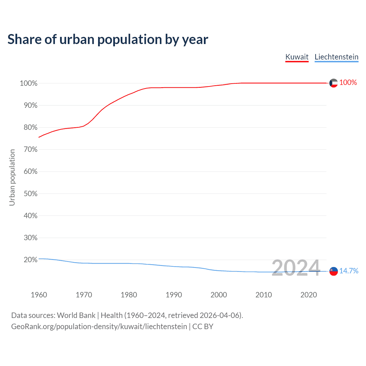 From 2004 to 2024, the share of urban population changed from 99.9% to 100% in Kuwait and from 14.7% to 14.7% in Liechtenstein.