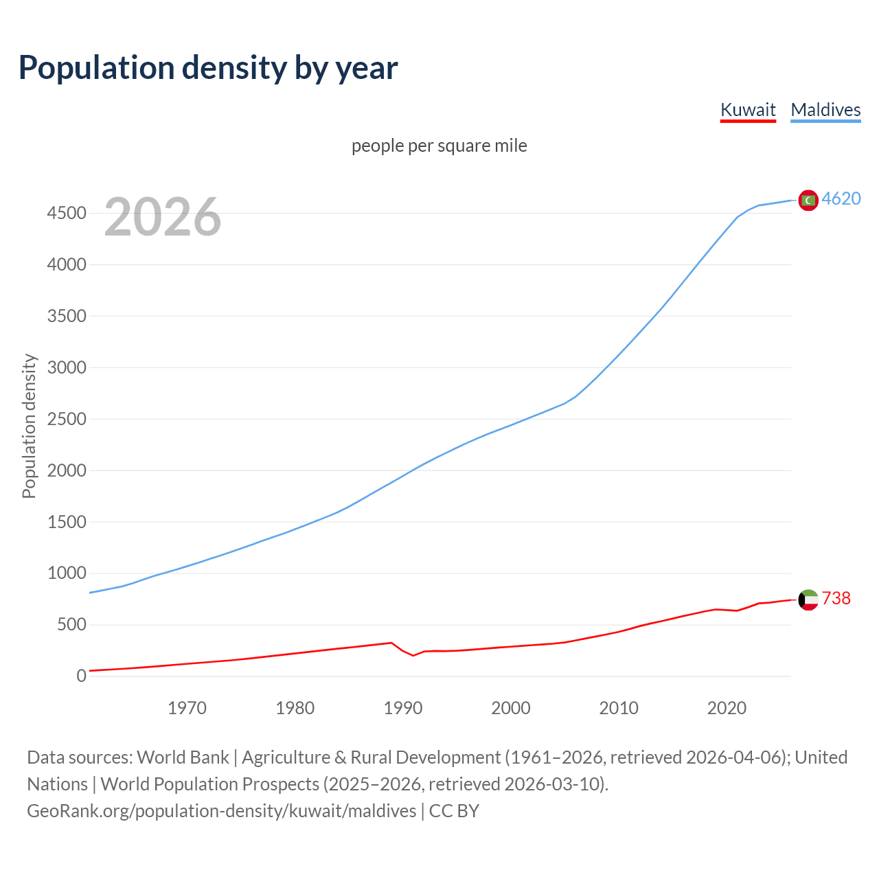 From 2006 to 2026, population density in Kuwait increased by 114.9%, compared to a 70.5% growth in Maldives.