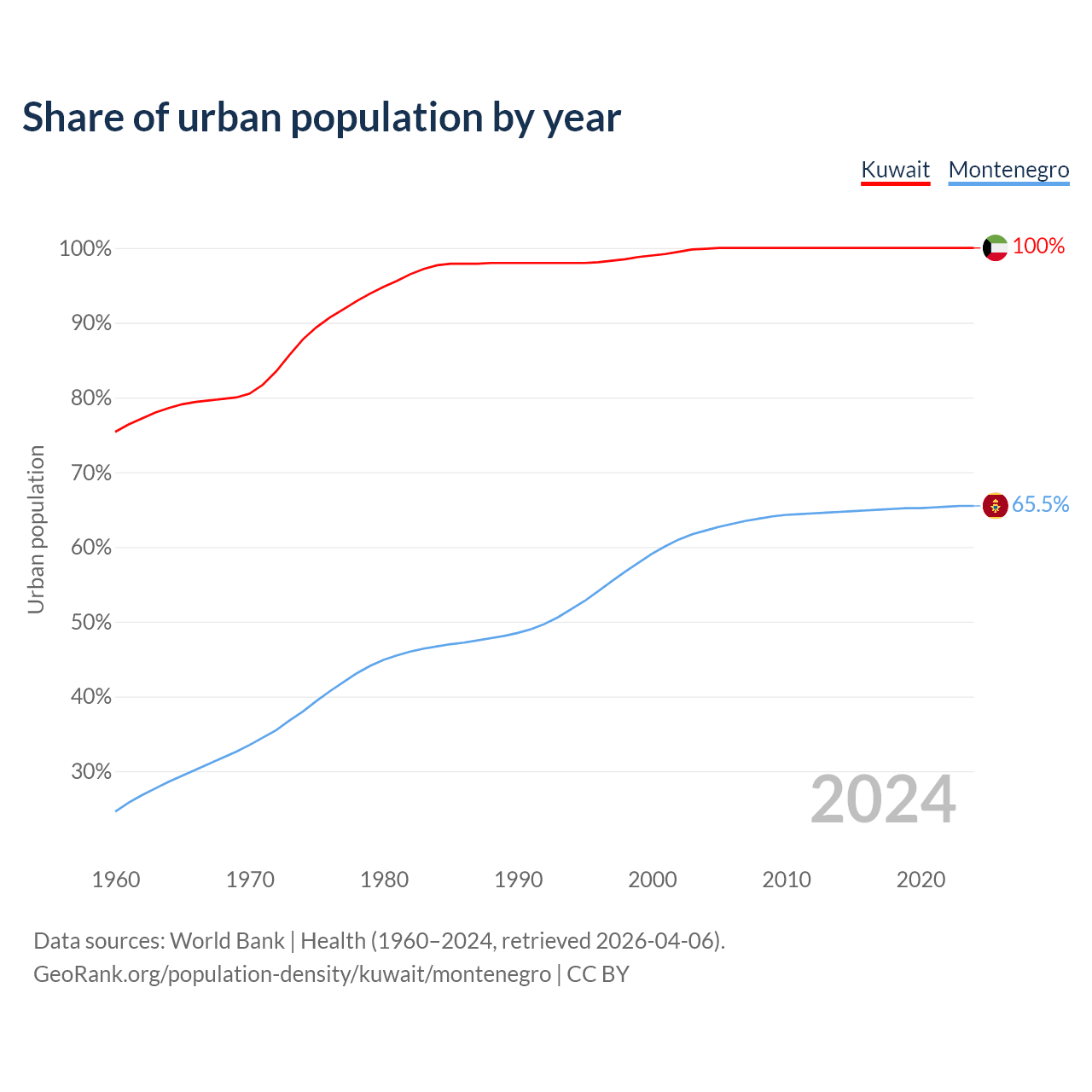 From 2006 to 2026, population density in Kuwait increased by 114.9%, compared to a 0.44% decline in Montenegro.