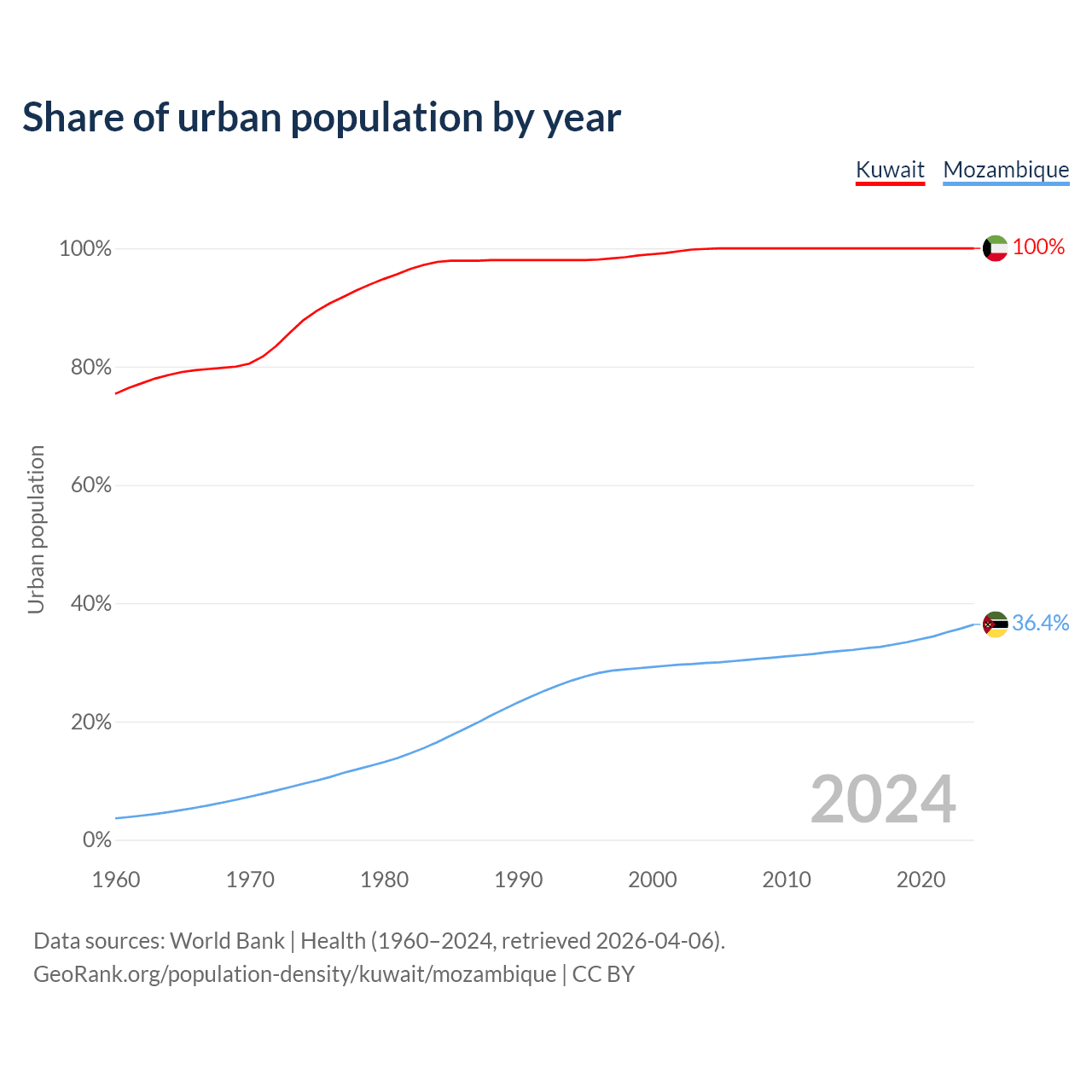 From 2004 to 2024, the share of urban population changed from 99.9% to 100% in Kuwait and from 29.9% to 36.4% in Mozambique.