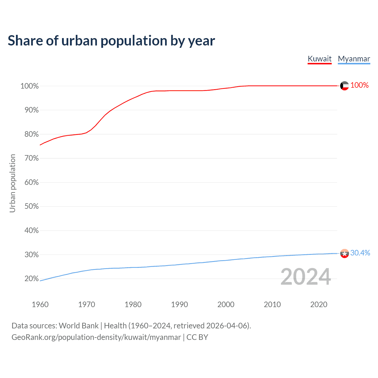 From 2004 to 2024, the share of urban population changed from 99.9% to 100% in Kuwait and from 28.2% to 30.4% in Myanmar.