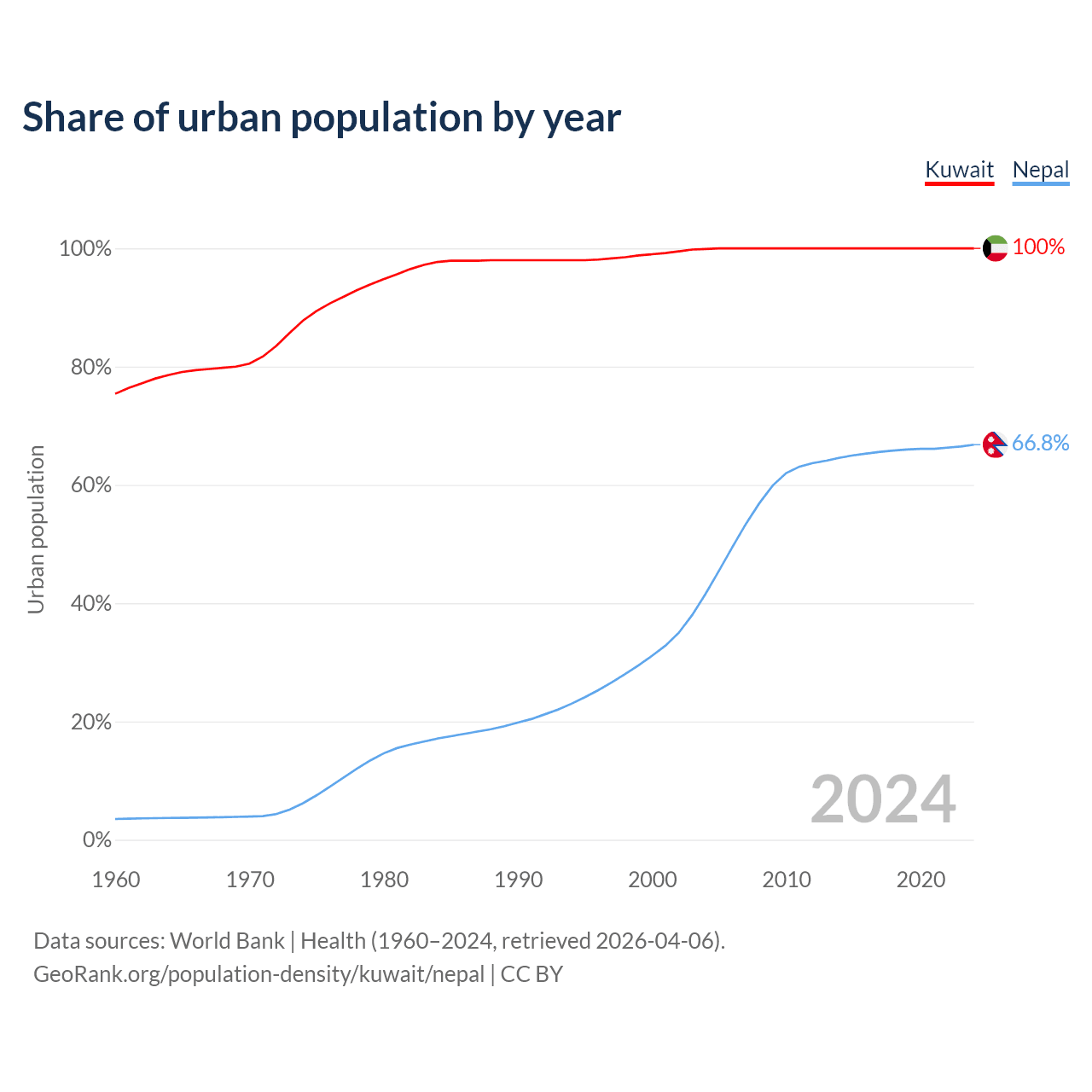 From 2004 to 2024, the share of urban population changed from 99.9% to 100% in Kuwait and from 41.6% to 66.8% in Nepal.
