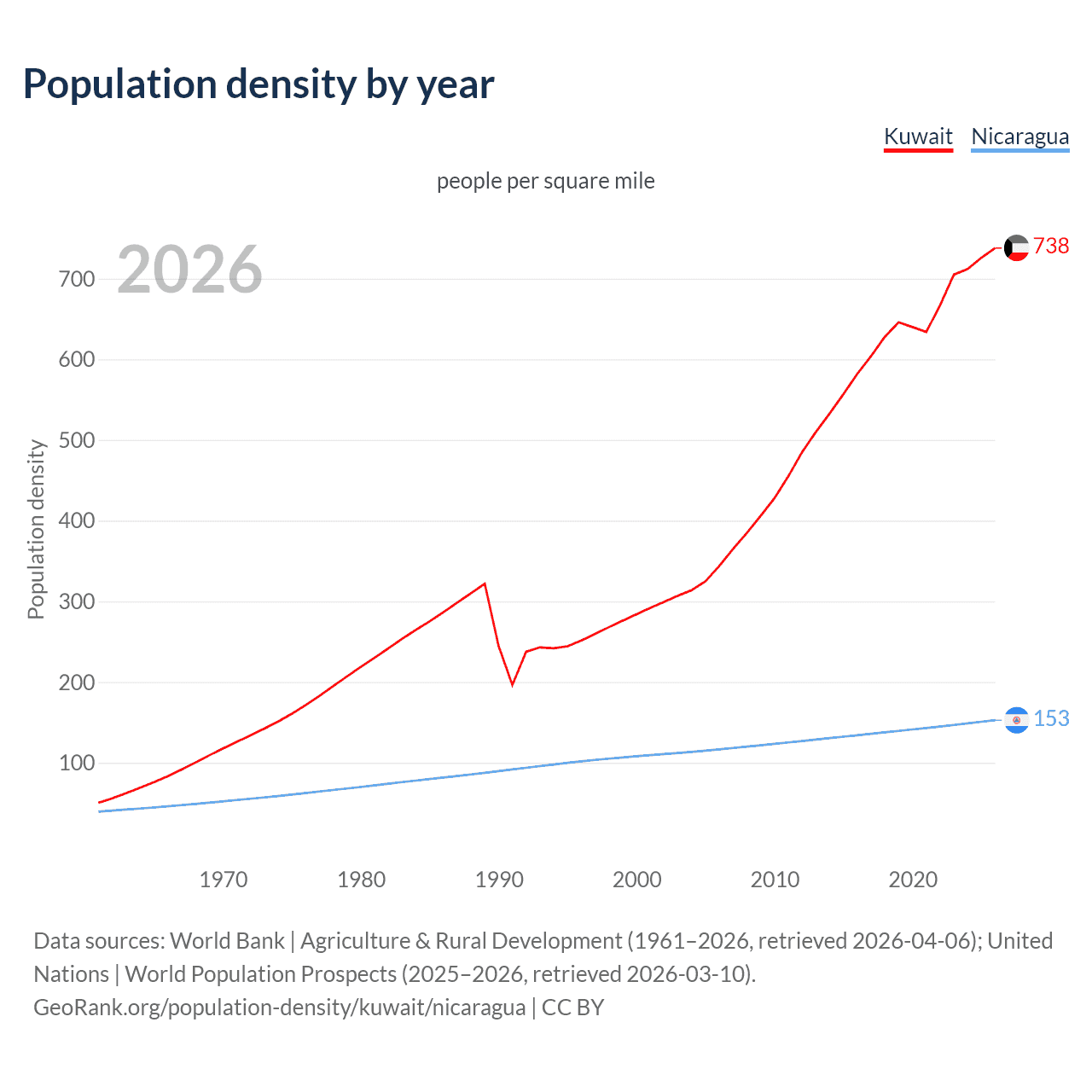 From 2006 to 2026, population density in Kuwait increased by 114.9%, compared to a 31% growth in Nicaragua.