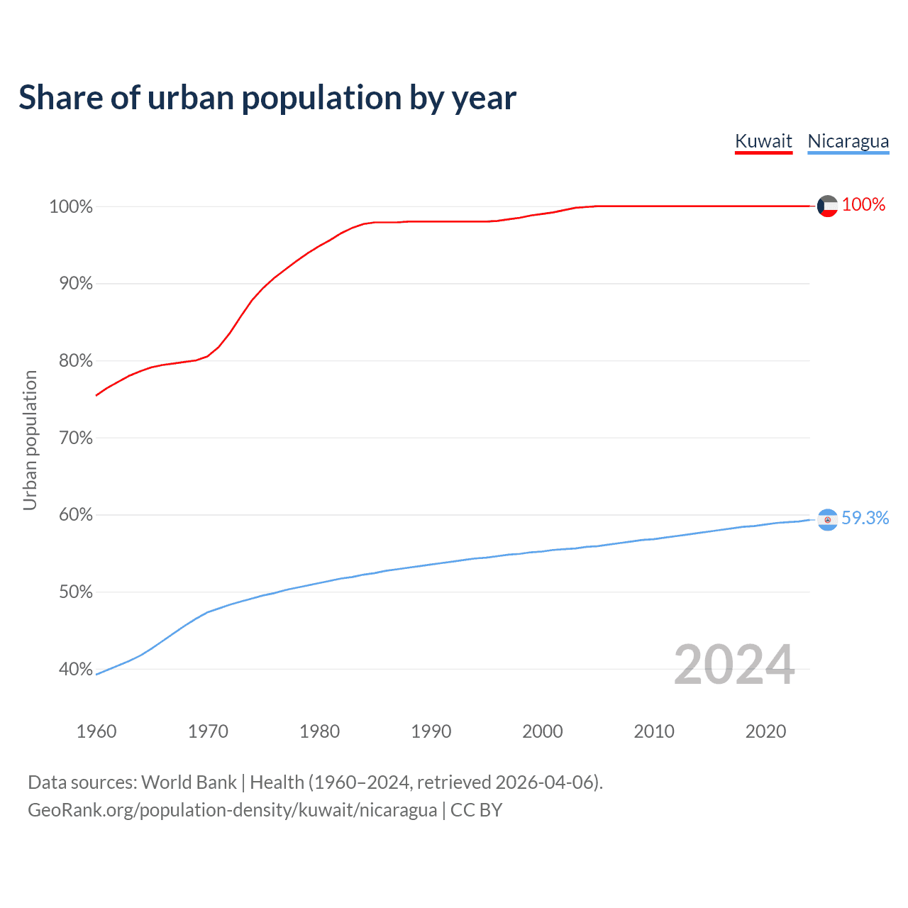From 2004 to 2024, the share of urban population changed from 99.9% to 100% in Kuwait and from 55.8% to 59.3% in Nicaragua.