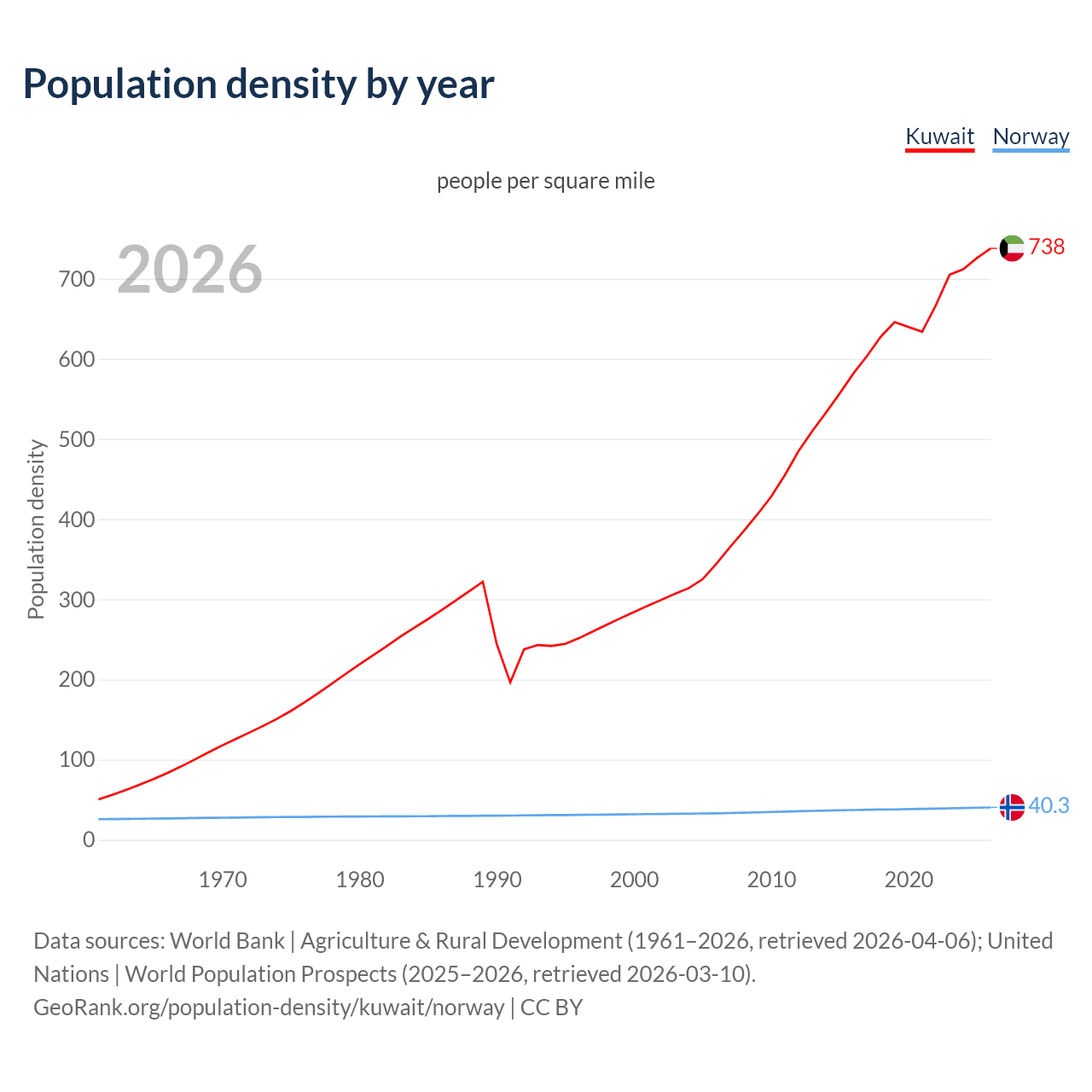 From 2006 to 2026, population density in Kuwait increased by 114.9%, compared to a 21.9% growth in Norway.