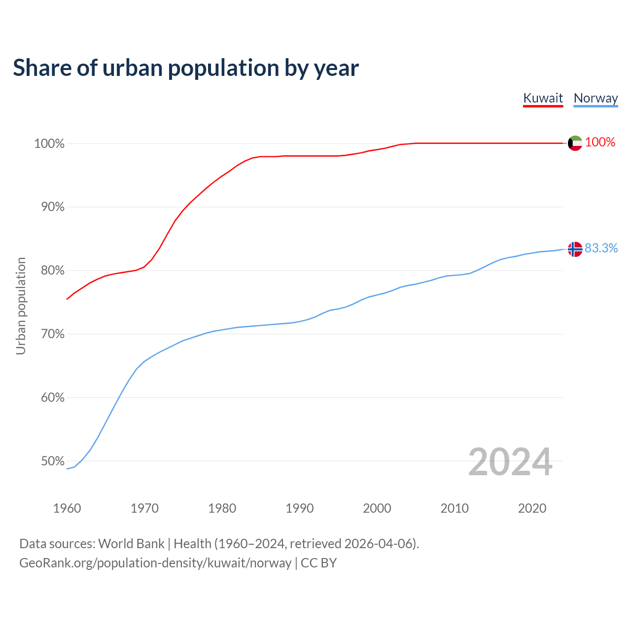 From 2004 to 2024, the share of urban population changed from 99.9% to 100% in Kuwait and from 77.6% to 83.3% in Norway.