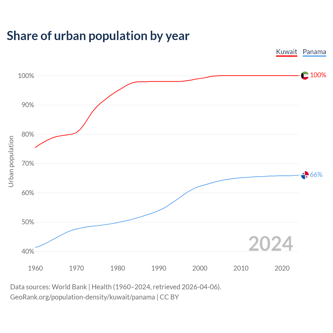 From 2004 to 2024, the share of urban population changed from 99.9% to 100% in Kuwait and from 63.8% to 66% in Panama.