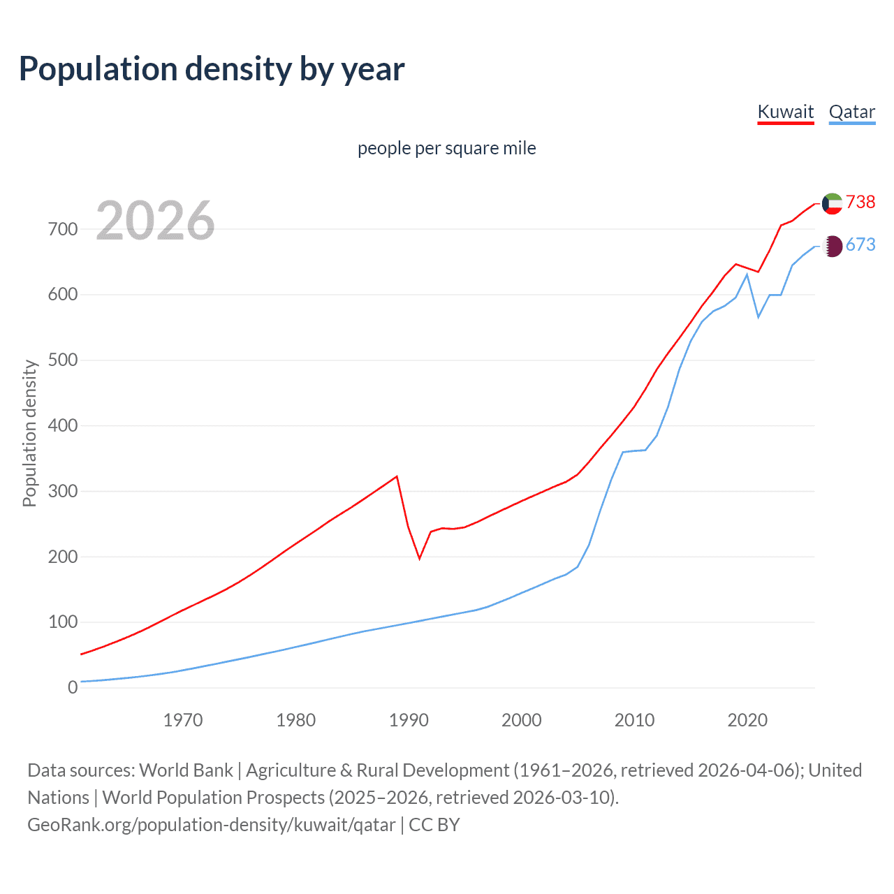 From 2006 to 2026, population density in Kuwait increased by 114.9%, compared to a 210.1% growth in Qatar.