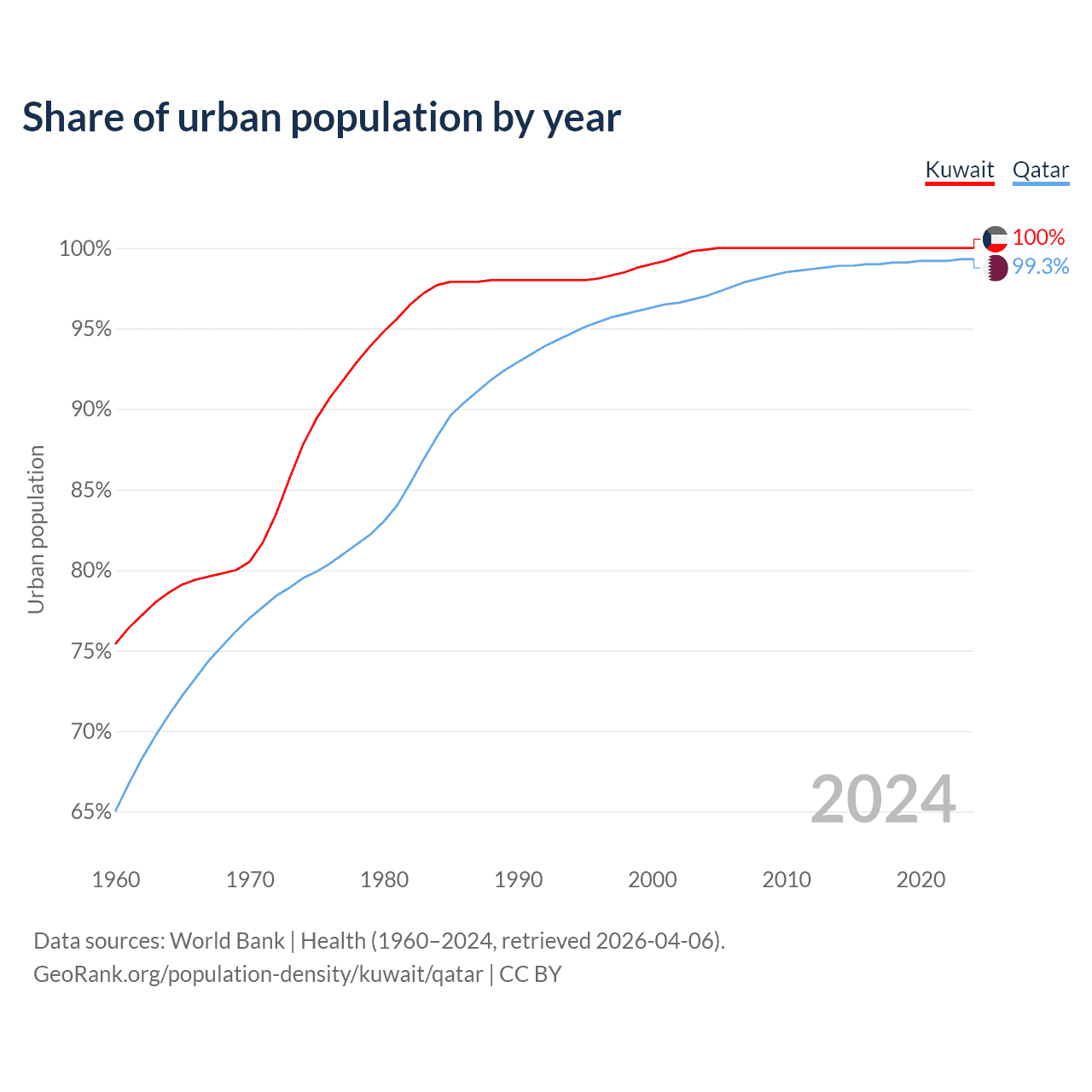 From 2004 to 2024, the share of urban population changed from 99.9% to 100% in Kuwait and from 97% to 99.3% in Qatar.