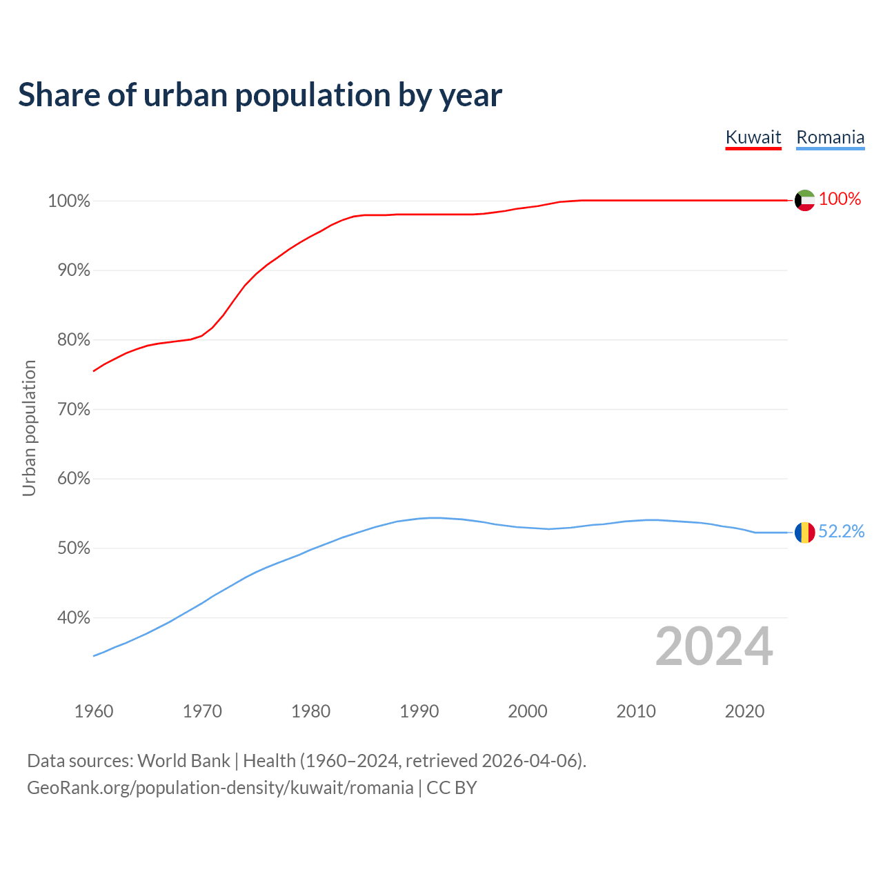 From 2006 to 2026, population density in Kuwait increased by 114.9%, compared to a 11.1% decline in Romania.