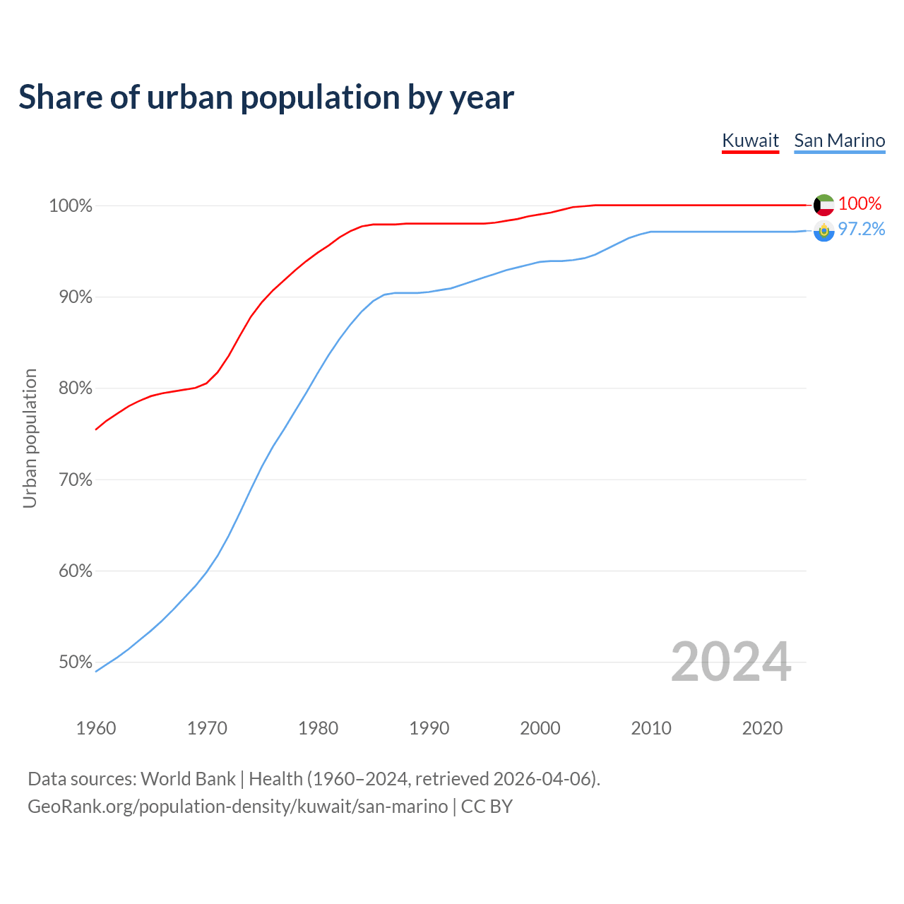 From 2004 to 2024, the share of urban population changed from 99.9% to 100% in Kuwait and from 94.2% to 97.2% in San Marino.