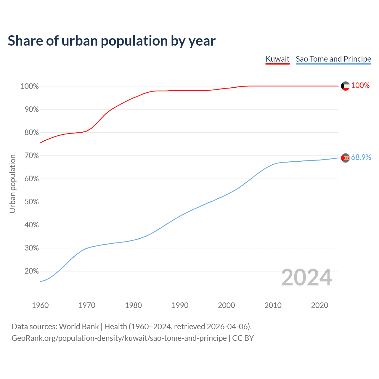 From 2004 to 2024, the share of urban population changed from 99.9% to 100% in Kuwait and from 57.9% to 68.9% in Sao Tome and Principe.