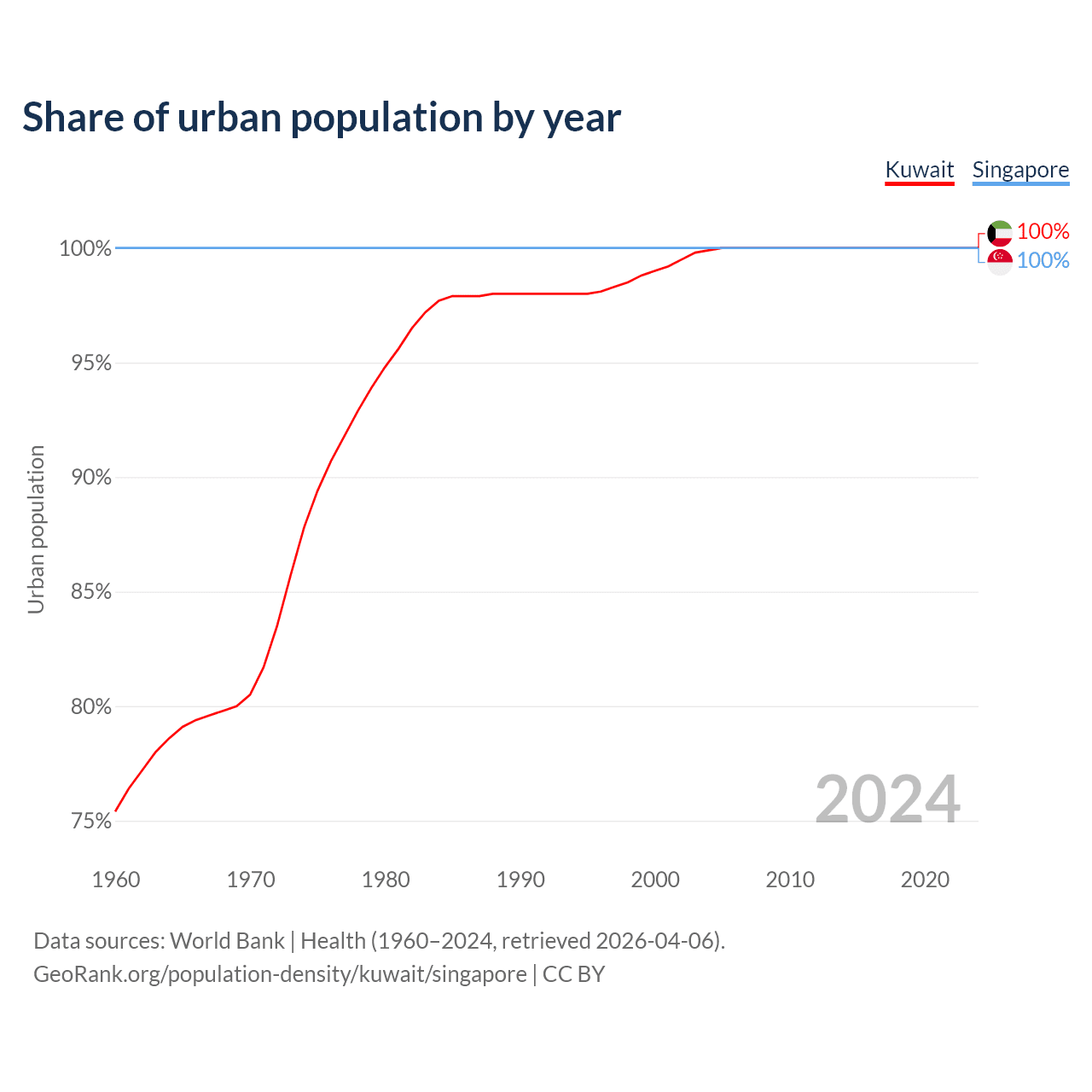 From 2004 to 2024, the share of urban population changed from 99.9% to 100% in Kuwait and from 100% to 100% in Singapore.