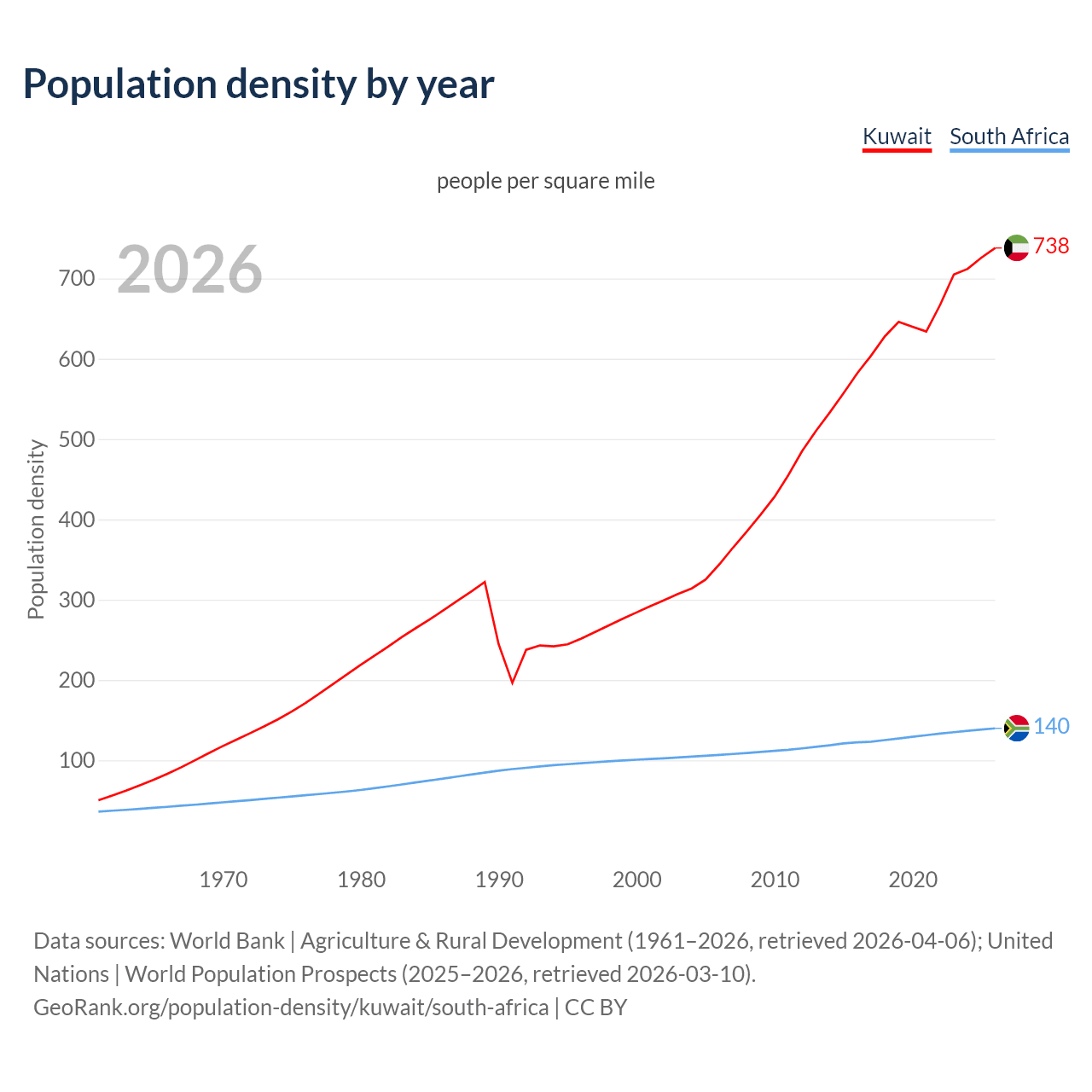 From 2006 to 2026, population density in Kuwait increased by 114.9%, compared to a 31% growth in South Africa.