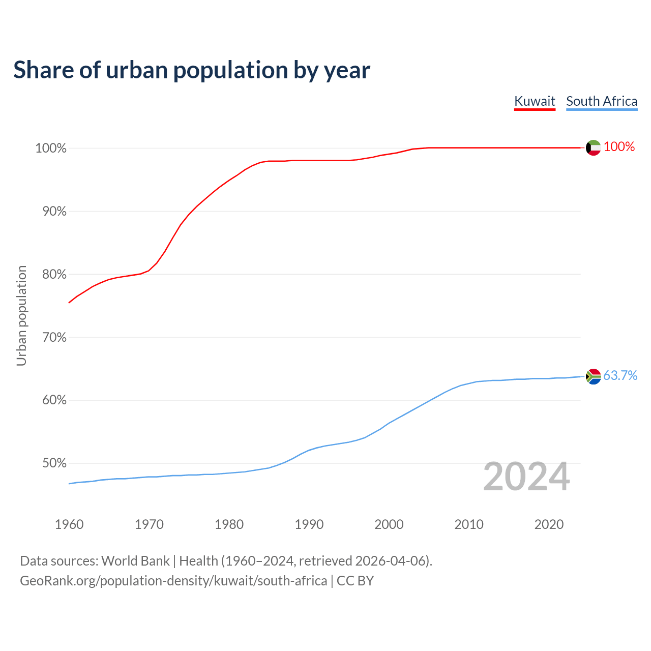 From 2004 to 2024, the share of urban population changed from 99.9% to 100% in Kuwait and from 59.1% to 63.7% in South Africa.