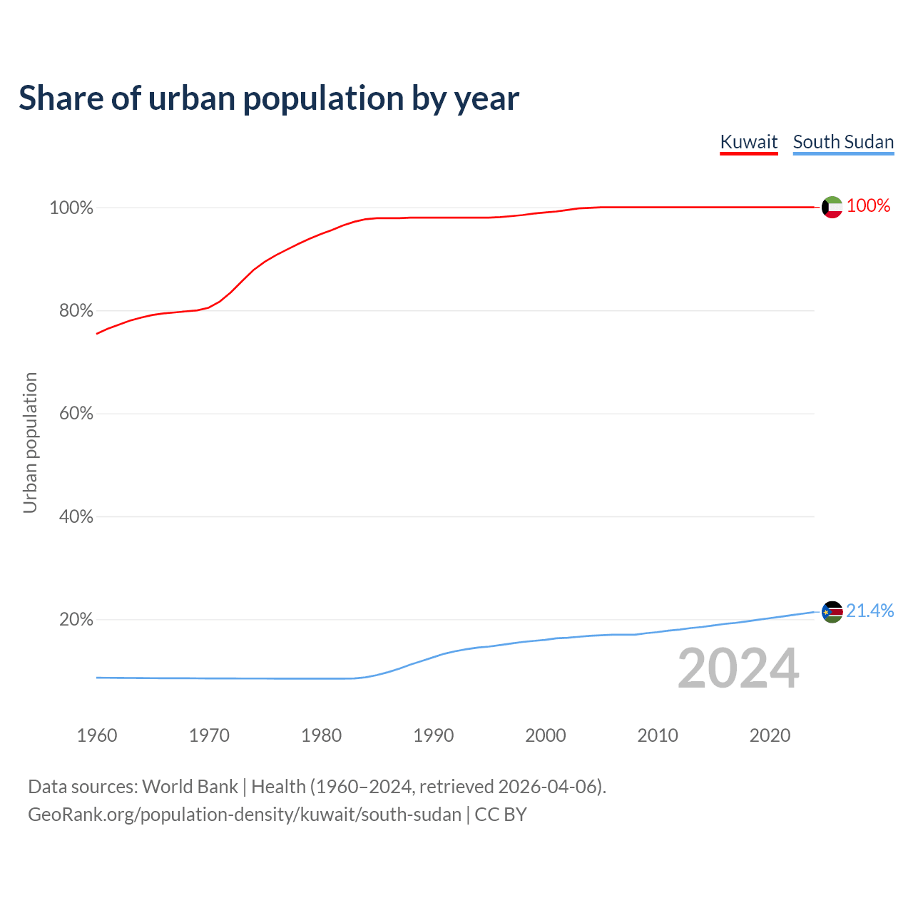 From 2004 to 2024, the share of urban population changed from 99.9% to 100% in Kuwait and from 16.8% to 21.4% in South Sudan.