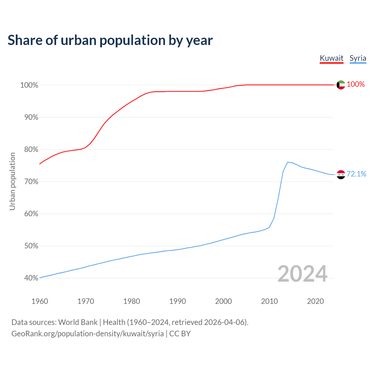 From 2004 to 2024, the share of urban population changed from 99.9% to 100% in Kuwait and from 53.5% to 72.1% in Syria.