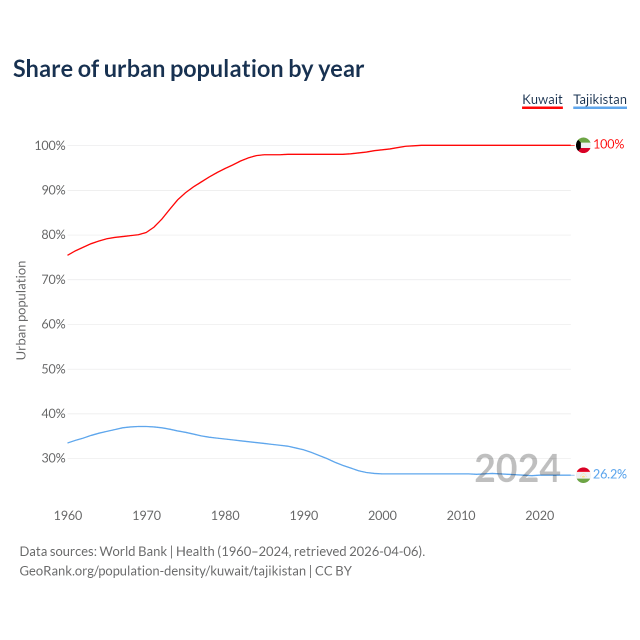 From 2004 to 2024, the share of urban population changed from 99.9% to 100% in Kuwait and from 26.5% to 26.2% in Tajikistan.