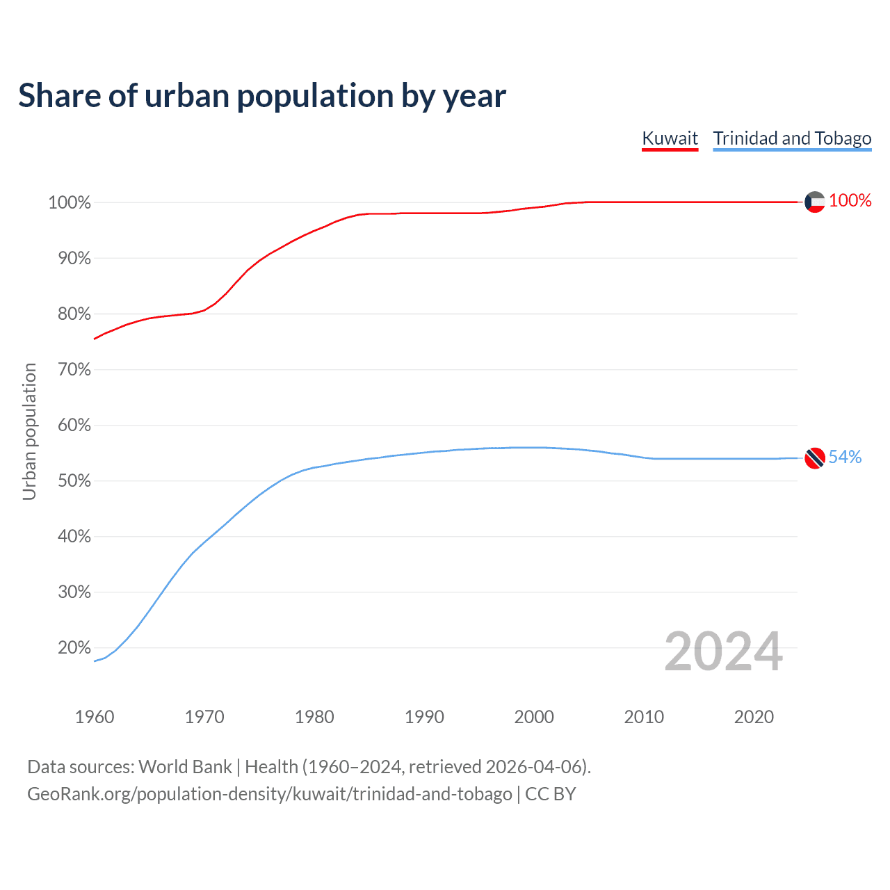 From 2004 to 2024, the share of urban population changed from 99.9% to 100% in Kuwait and from 55.6% to 54% in Trinidad and Tobago.