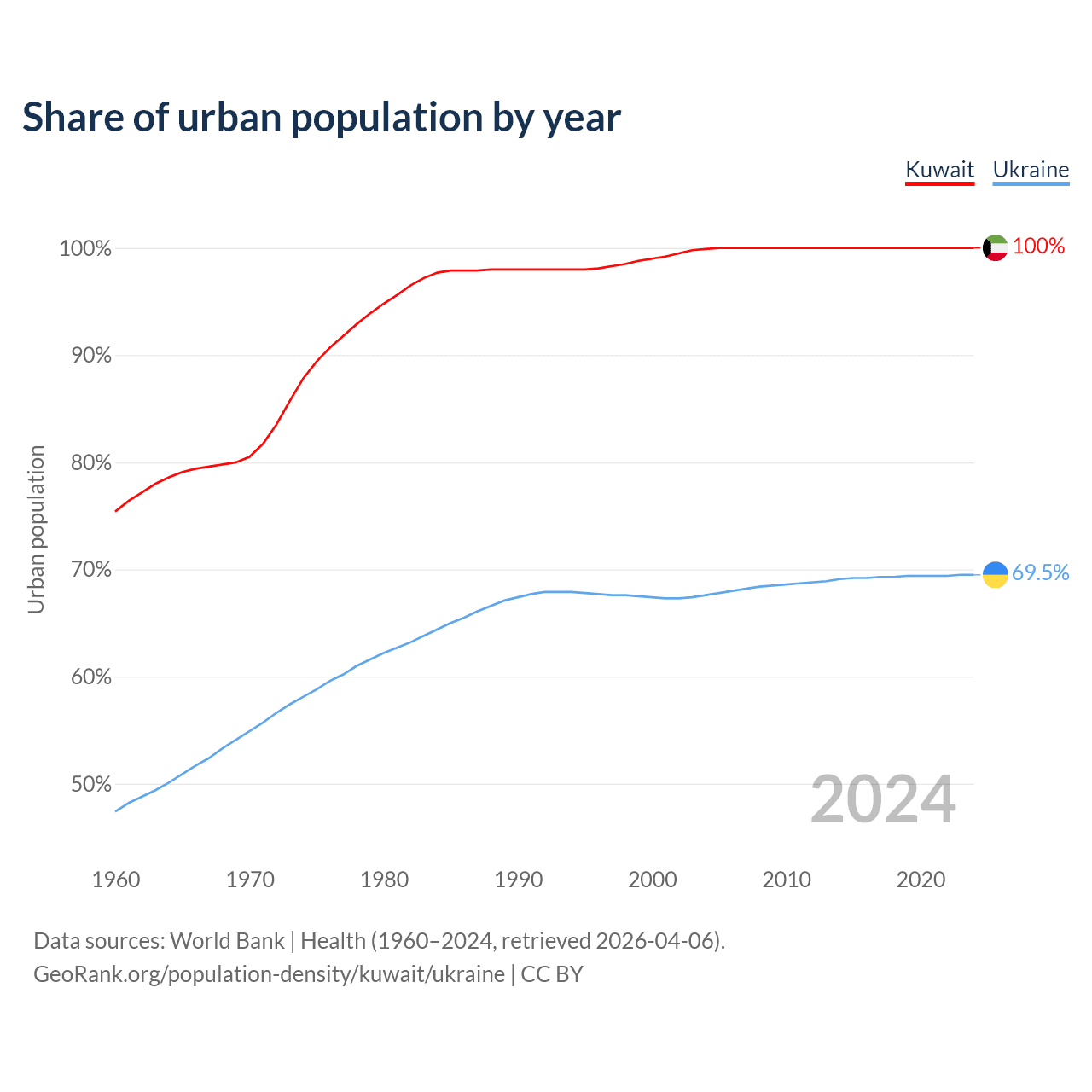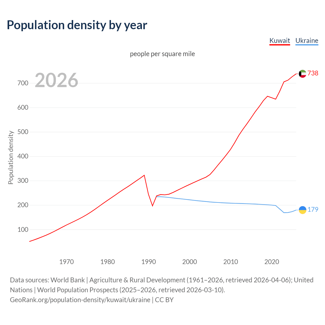 From 2006 to 2026, population density in Kuwait increased by 114.9%, compared to a 15.1% decline in Ukraine.