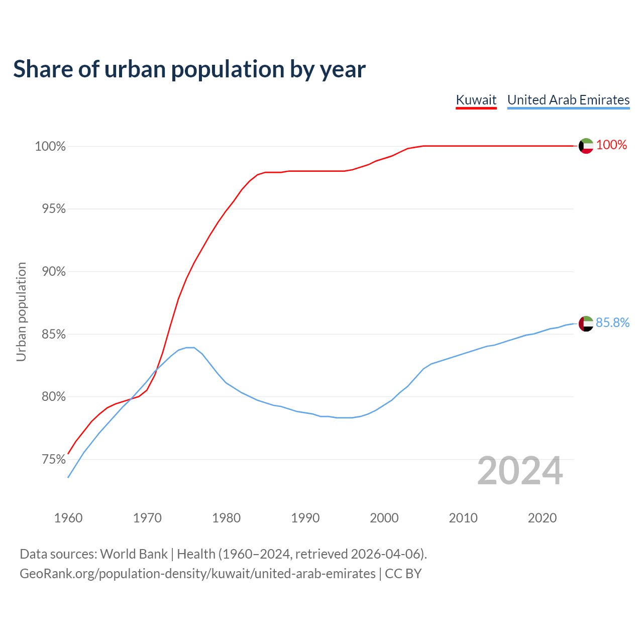 From 2004 to 2024, the share of urban population changed from 99.9% to 100% in Kuwait and from 81.5% to 85.8% in the United Arab Emirates.