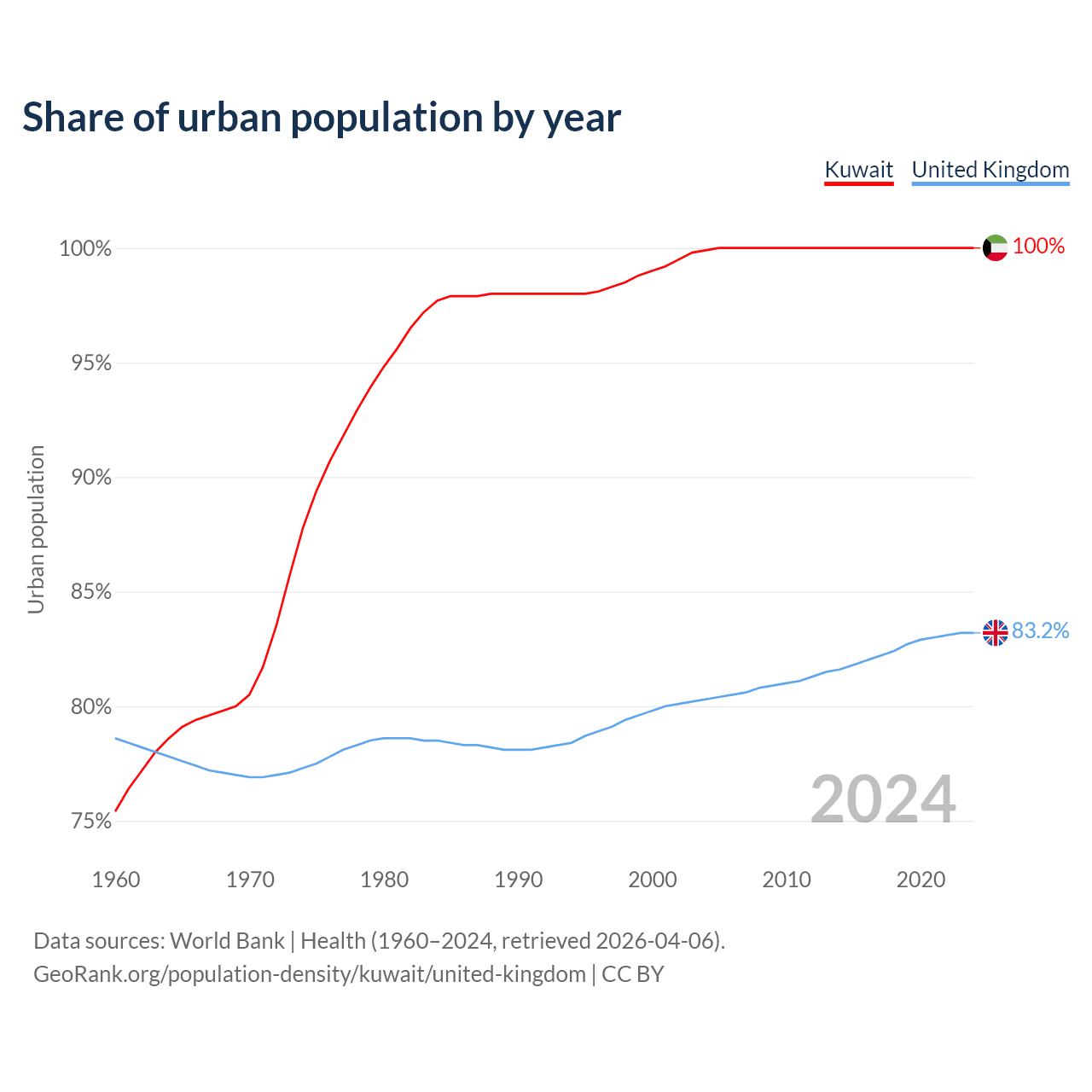 From 2006 to 2026, population density in Kuwait increased by 114.9%, compared to a 15.1% growth in the United Kingdom.