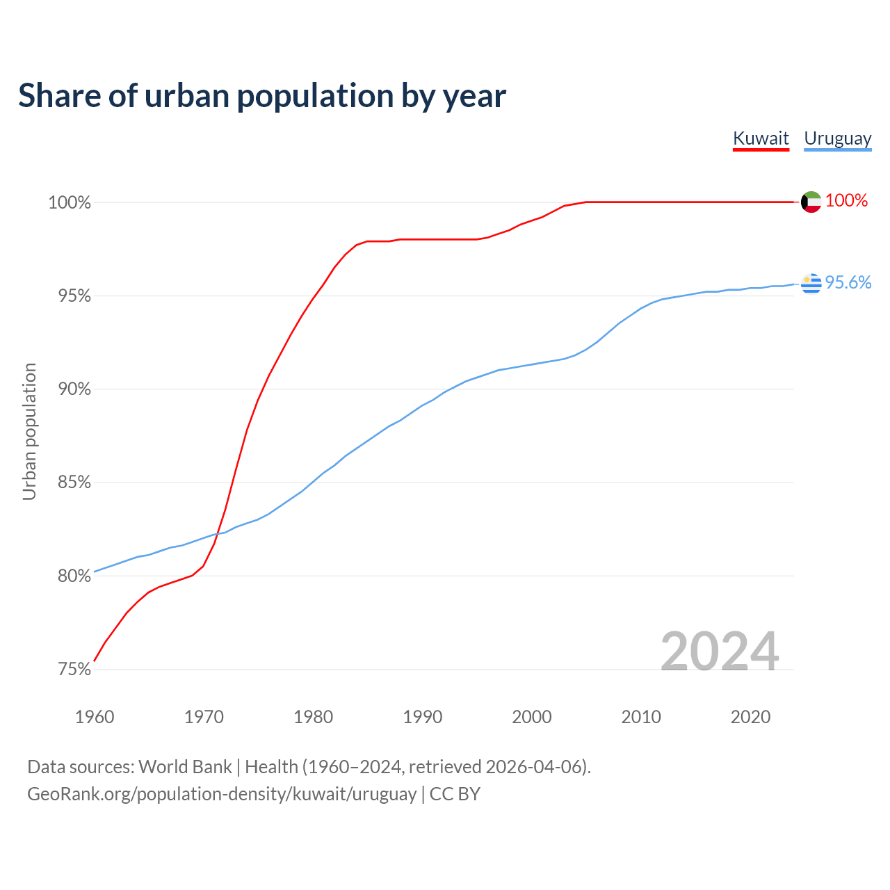 From 2004 to 2024, the share of urban population changed from 99.9% to 100% in Kuwait and from 91.8% to 95.6% in Uruguay.