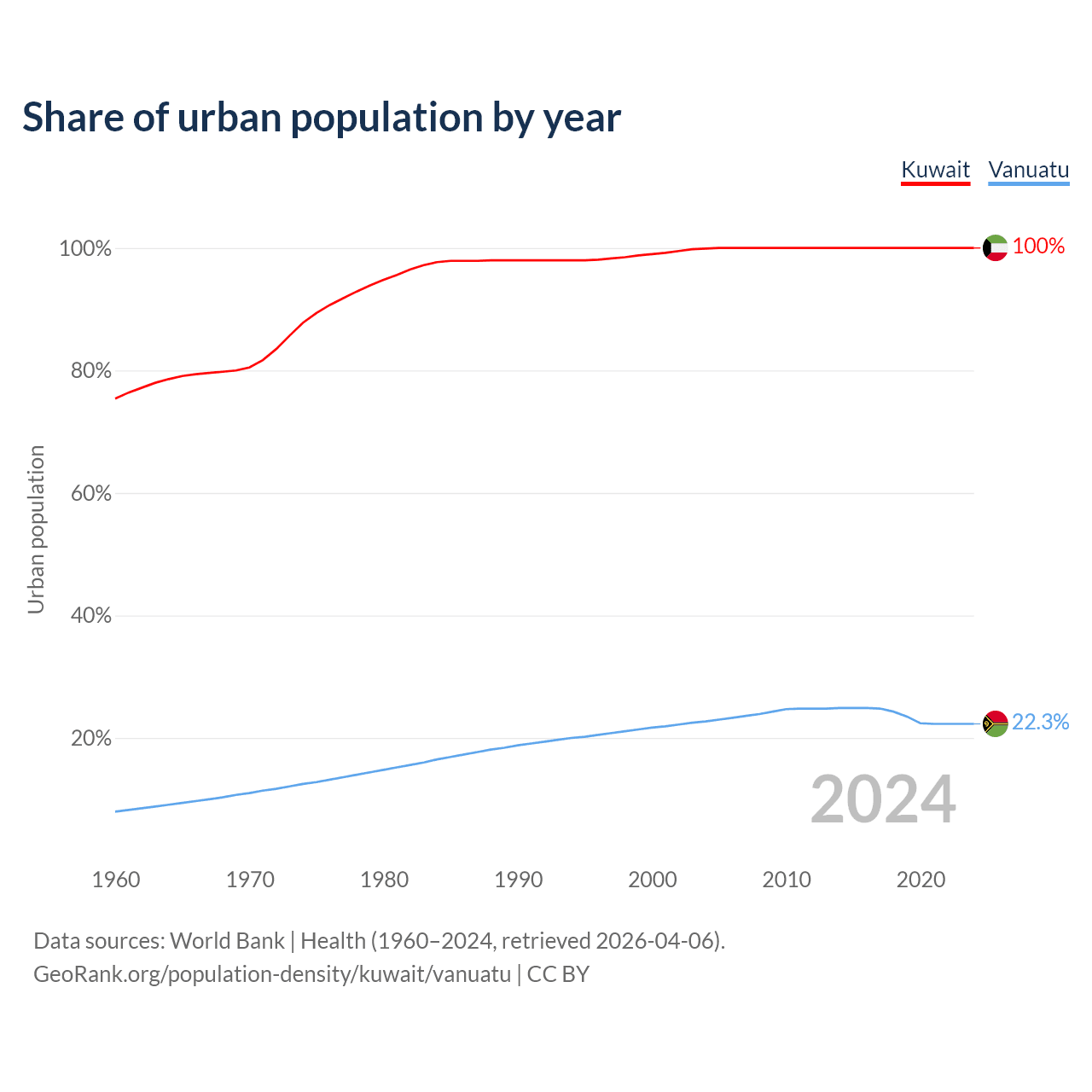 From 2004 to 2024, the share of urban population changed from 99.9% to 100% in Kuwait and from 22.7% to 22.3% in Vanuatu.