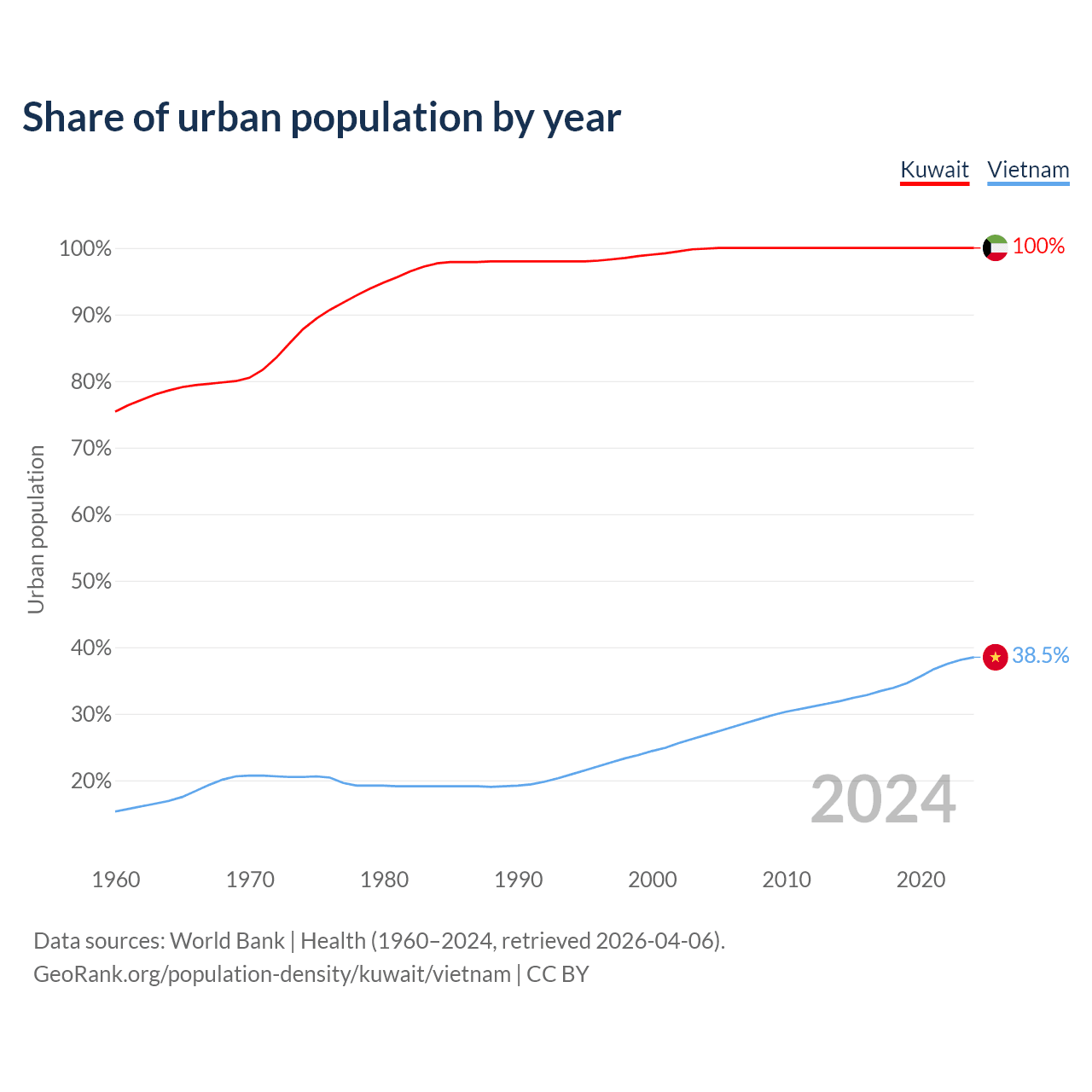 From 2006 to 2026, population density in Kuwait increased by 114.9%, compared to a 24.1% growth in Vietnam.