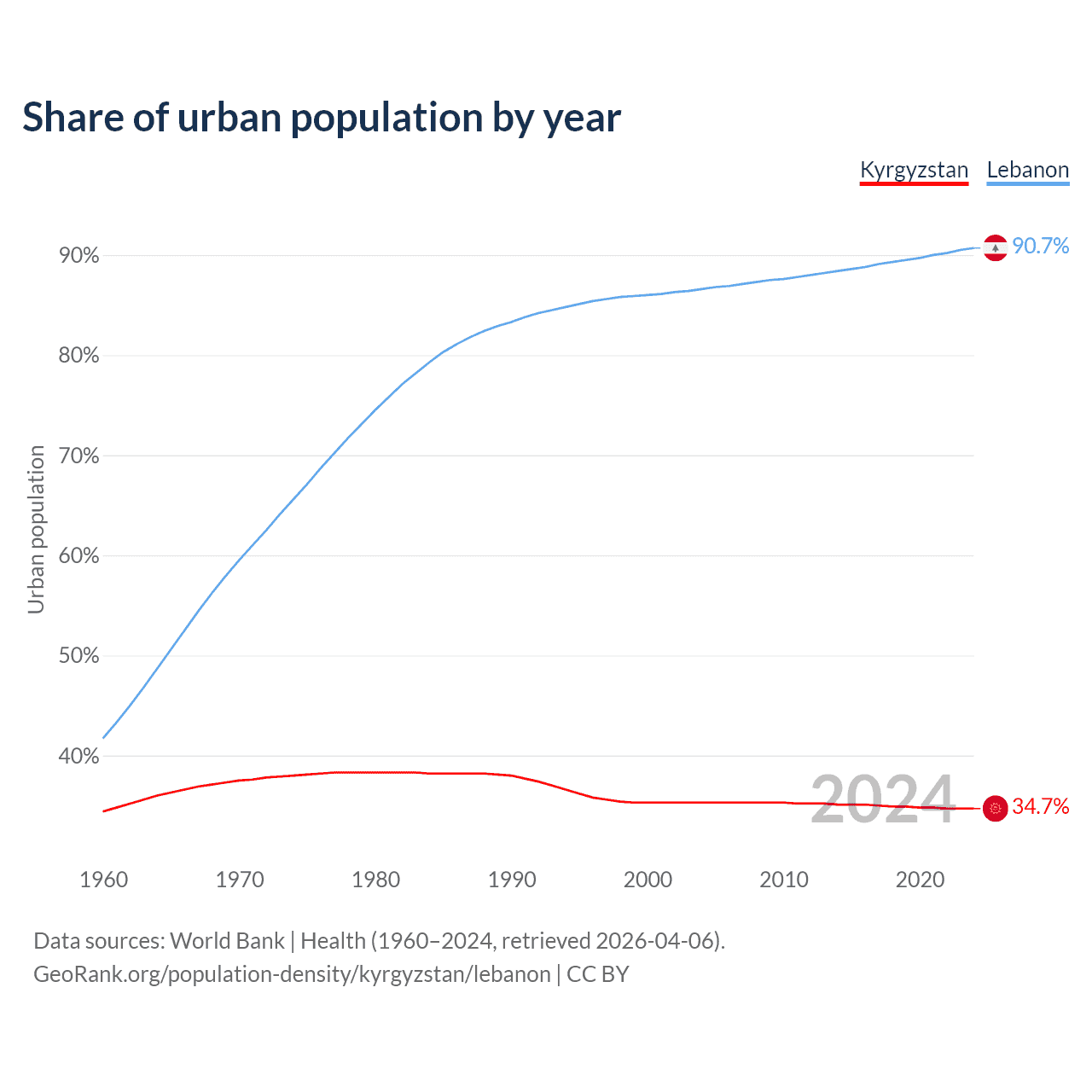 From 2004 to 2024, the share of urban population changed from 35.3% to 34.7% in Kyrgyzstan and from 86.6% to 90.7% in Lebanon.