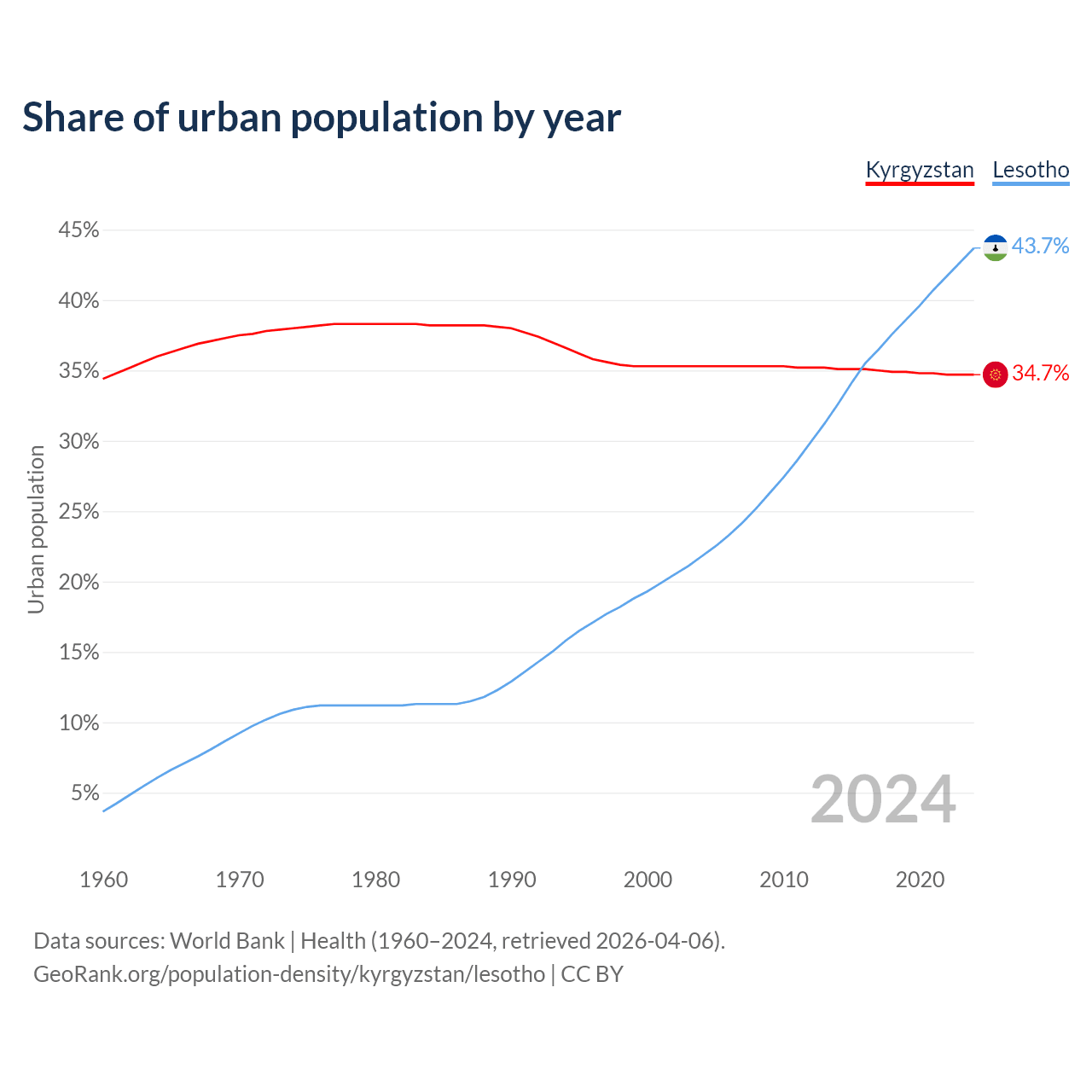 From 2004 to 2024, the share of urban population changed from 35.3% to 34.7% in Kyrgyzstan and from 21.8% to 43.7% in Lesotho.