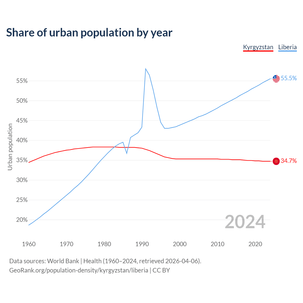 From 2004 to 2024, the share of urban population changed from 35.3% to 34.7% in Kyrgyzstan and from 45.4% to 55.5% in Liberia.
