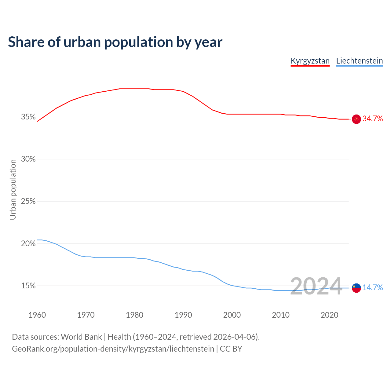 From 2004 to 2024, the share of urban population changed from 35.3% to 34.7% in Kyrgyzstan and from 14.7% to 14.7% in Liechtenstein.