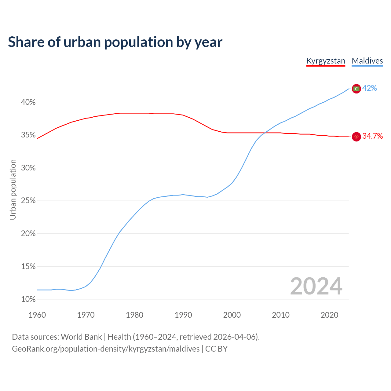 From 2004 to 2024, the share of urban population changed from 35.3% to 34.7% in Kyrgyzstan and from 32.9% to 42% in Maldives.