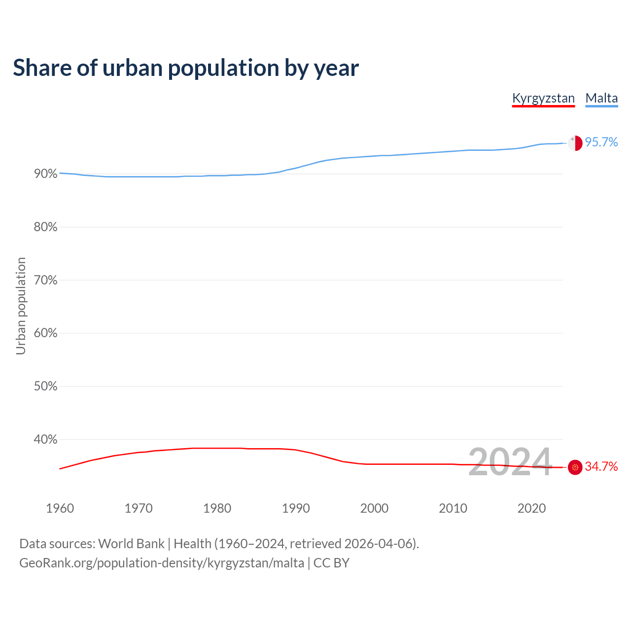 From 2004 to 2024, the share of urban population changed from 35.3% to 34.7% in Kyrgyzstan and from 93.6% to 95.7% in Malta.