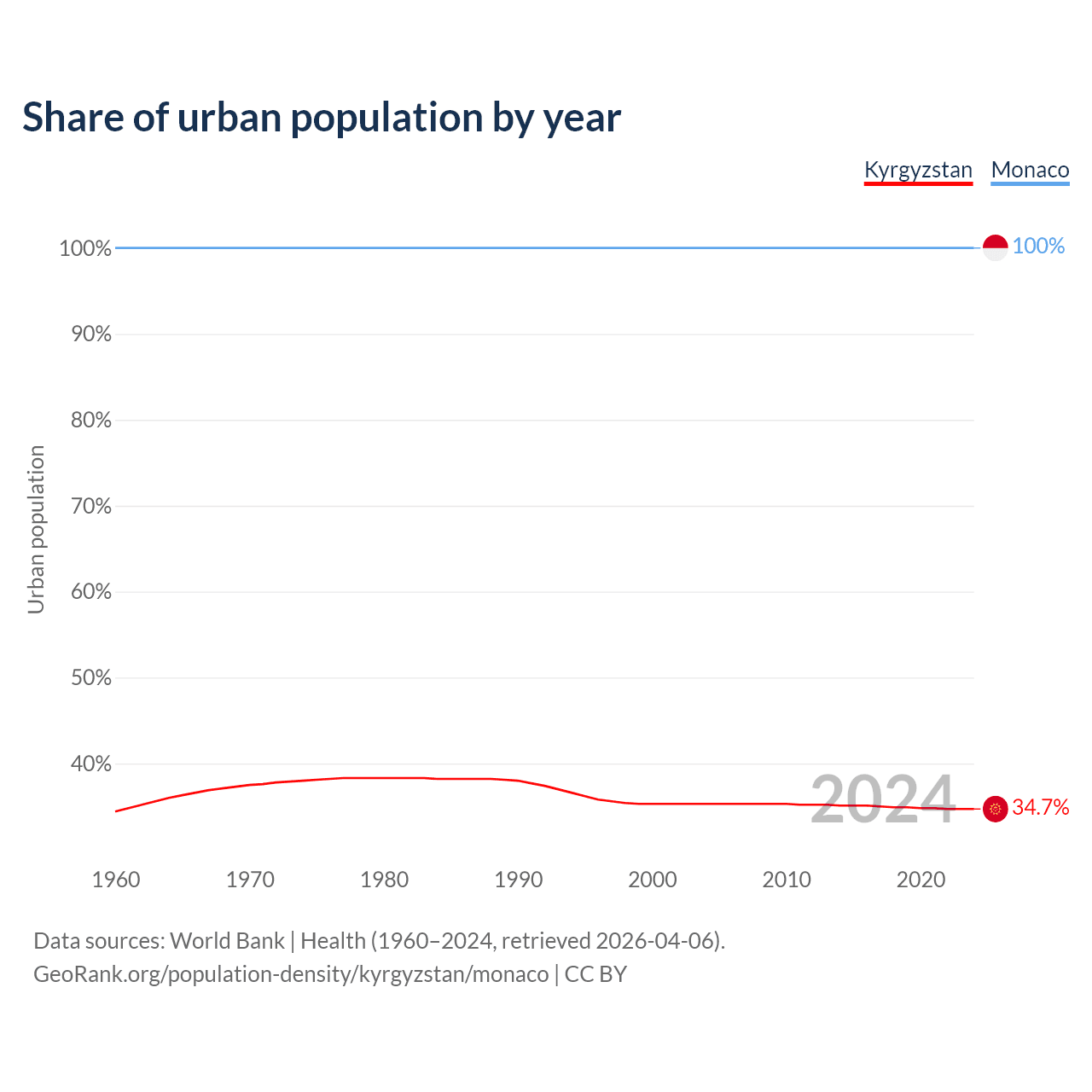 From 2004 to 2024, the share of urban population changed from 35.3% to 34.7% in Kyrgyzstan and from 100% to 100% in Monaco.