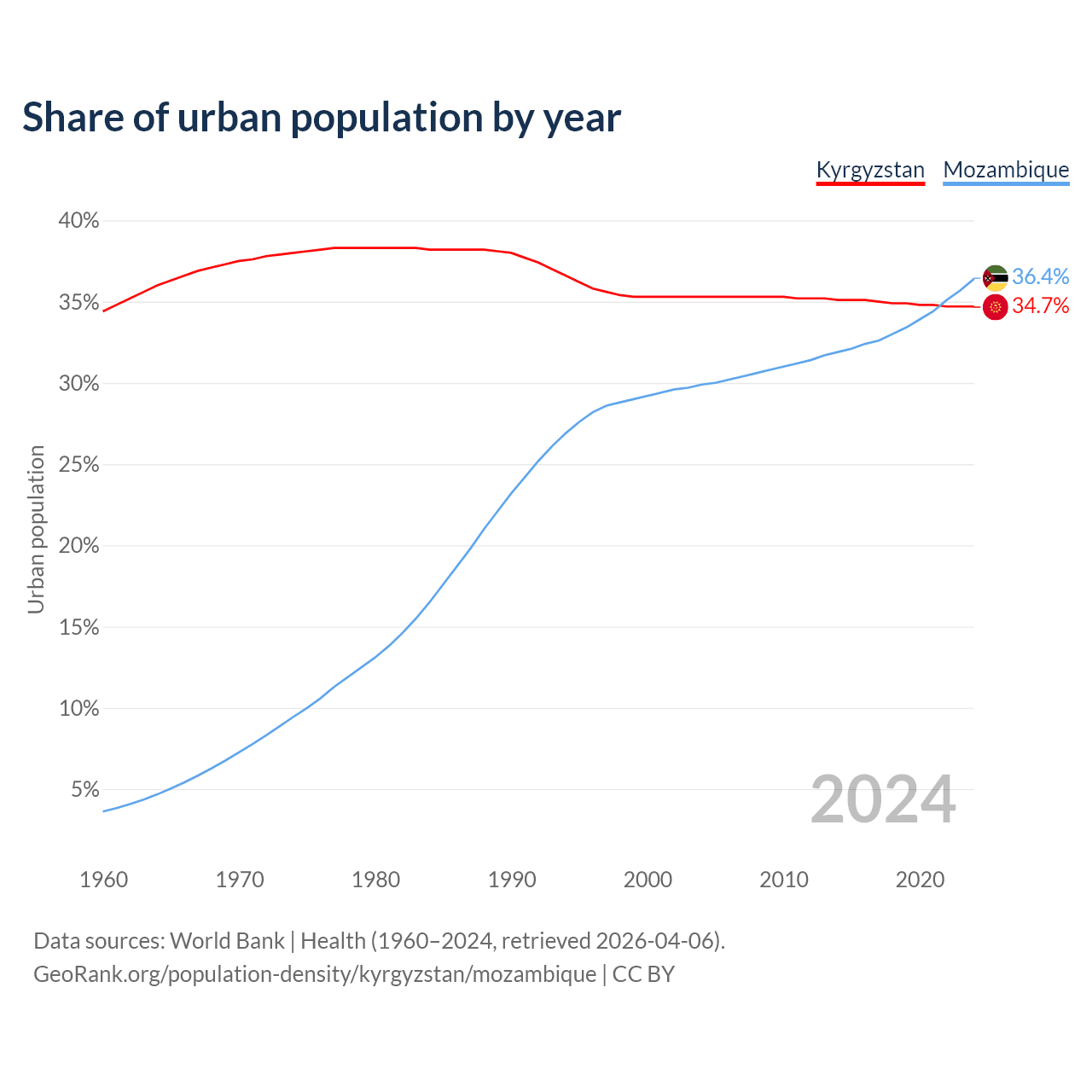 From 2004 to 2024, the share of urban population changed from 35.3% to 34.7% in Kyrgyzstan and from 29.9% to 36.4% in Mozambique.