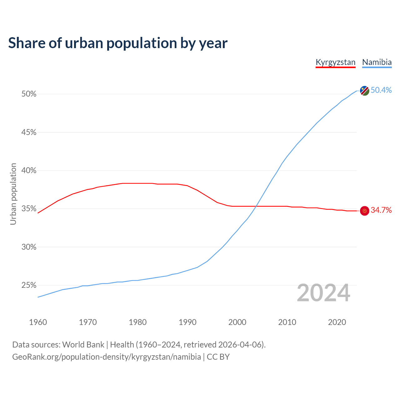 From 2004 to 2024, the share of urban population changed from 35.3% to 34.7% in Kyrgyzstan and from 35.5% to 50.4% in Namibia.