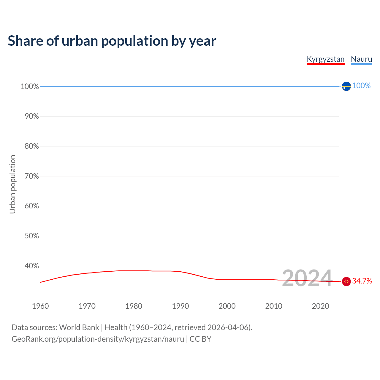 From 2004 to 2024, the share of urban population changed from 35.3% to 34.7% in Kyrgyzstan and from 100% to 100% in Nauru.