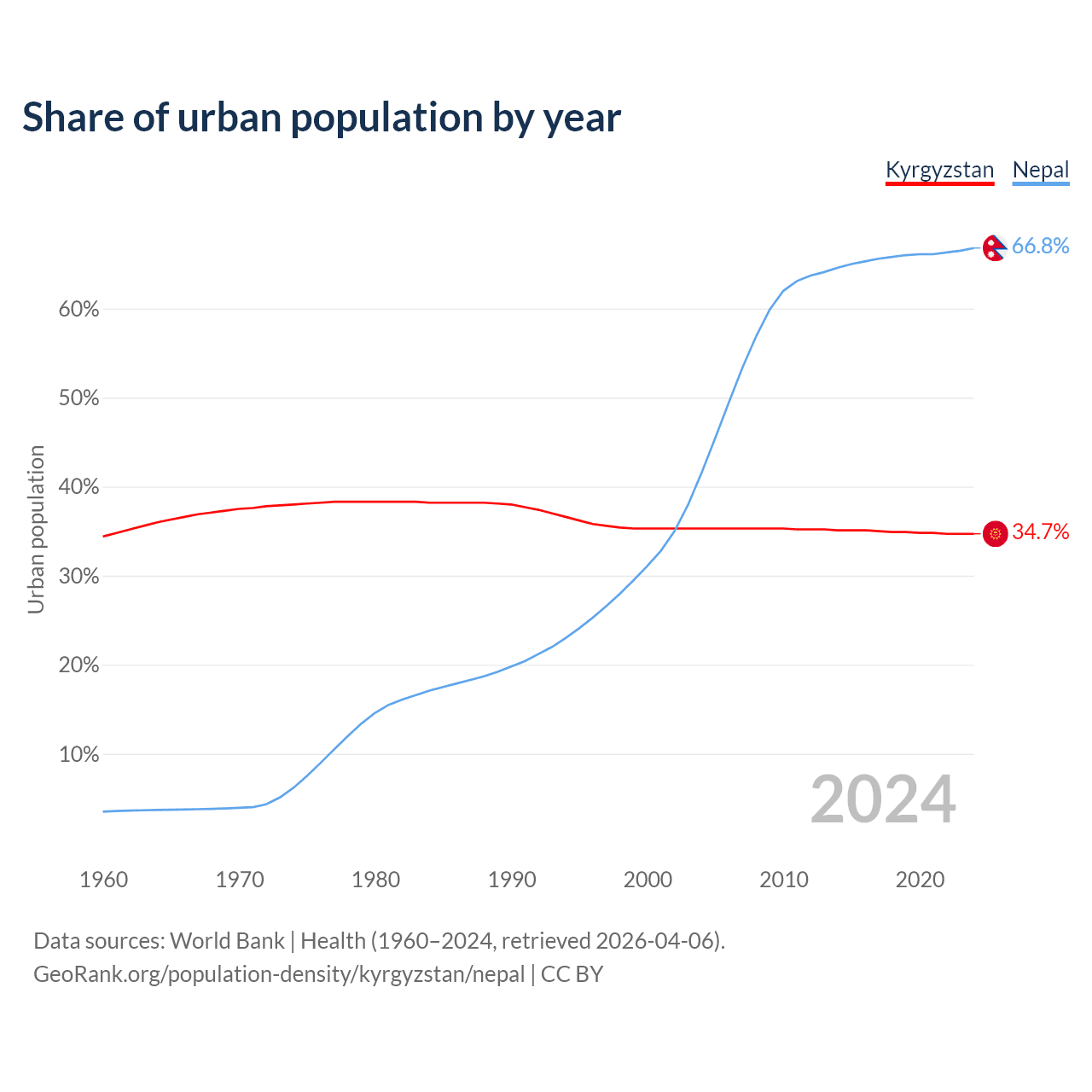 From 2004 to 2024, the share of urban population changed from 35.3% to 34.7% in Kyrgyzstan and from 41.6% to 66.8% in Nepal.