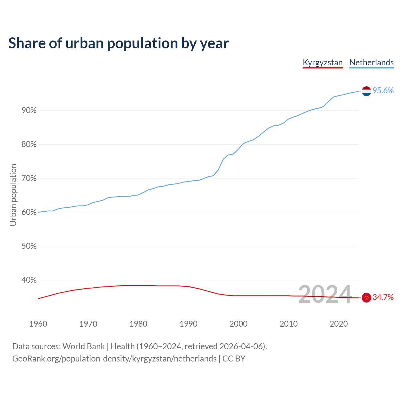 From 2004 to 2024, the share of urban population changed from 35.3% to 34.7% in Kyrgyzstan and from 82.3% to 95.6% in the Netherlands.