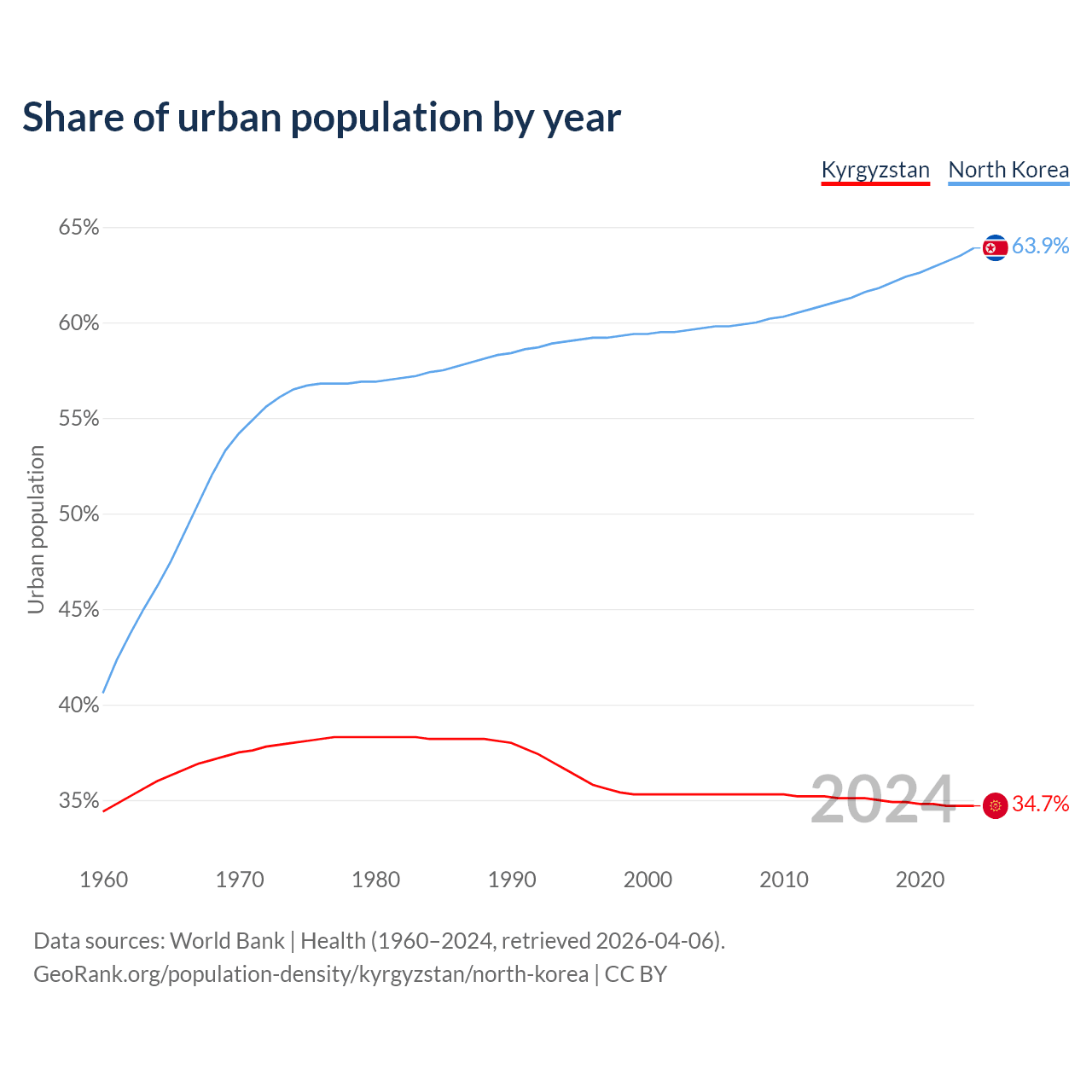 From 2004 to 2024, the share of urban population changed from 35.3% to 34.7% in Kyrgyzstan and from 59.7% to 63.9% in North Korea.