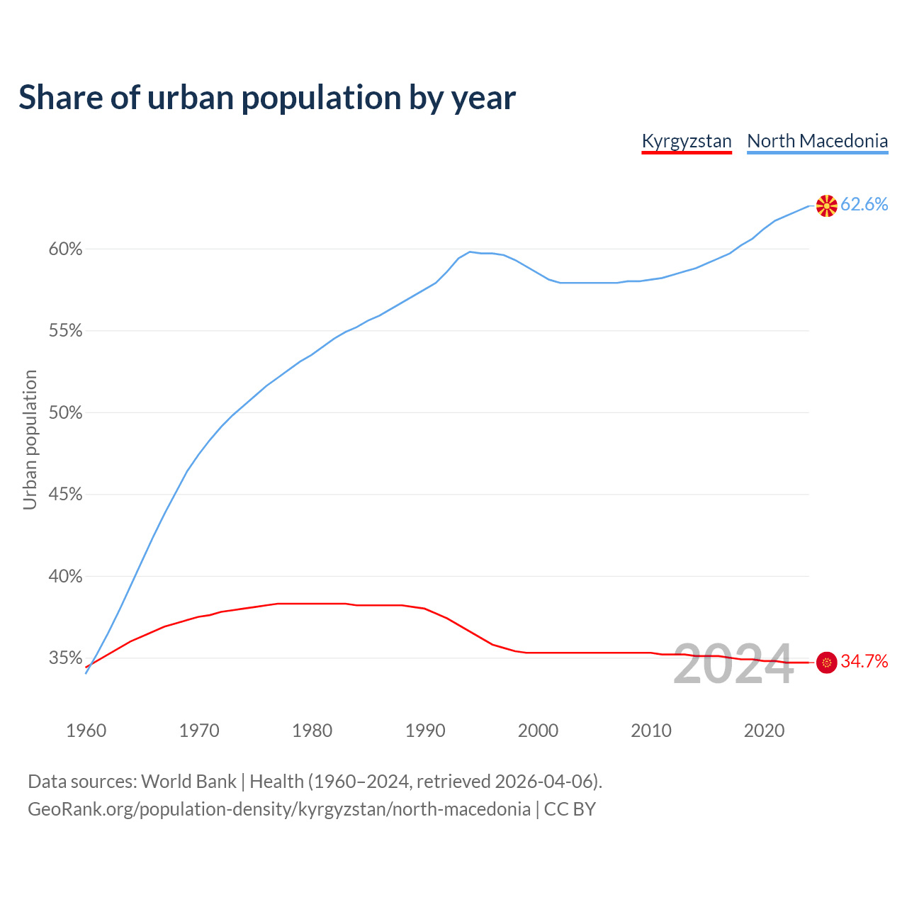 From 2004 to 2024, the share of urban population changed from 35.3% to 34.7% in Kyrgyzstan and from 57.9% to 62.6% in North Macedonia.