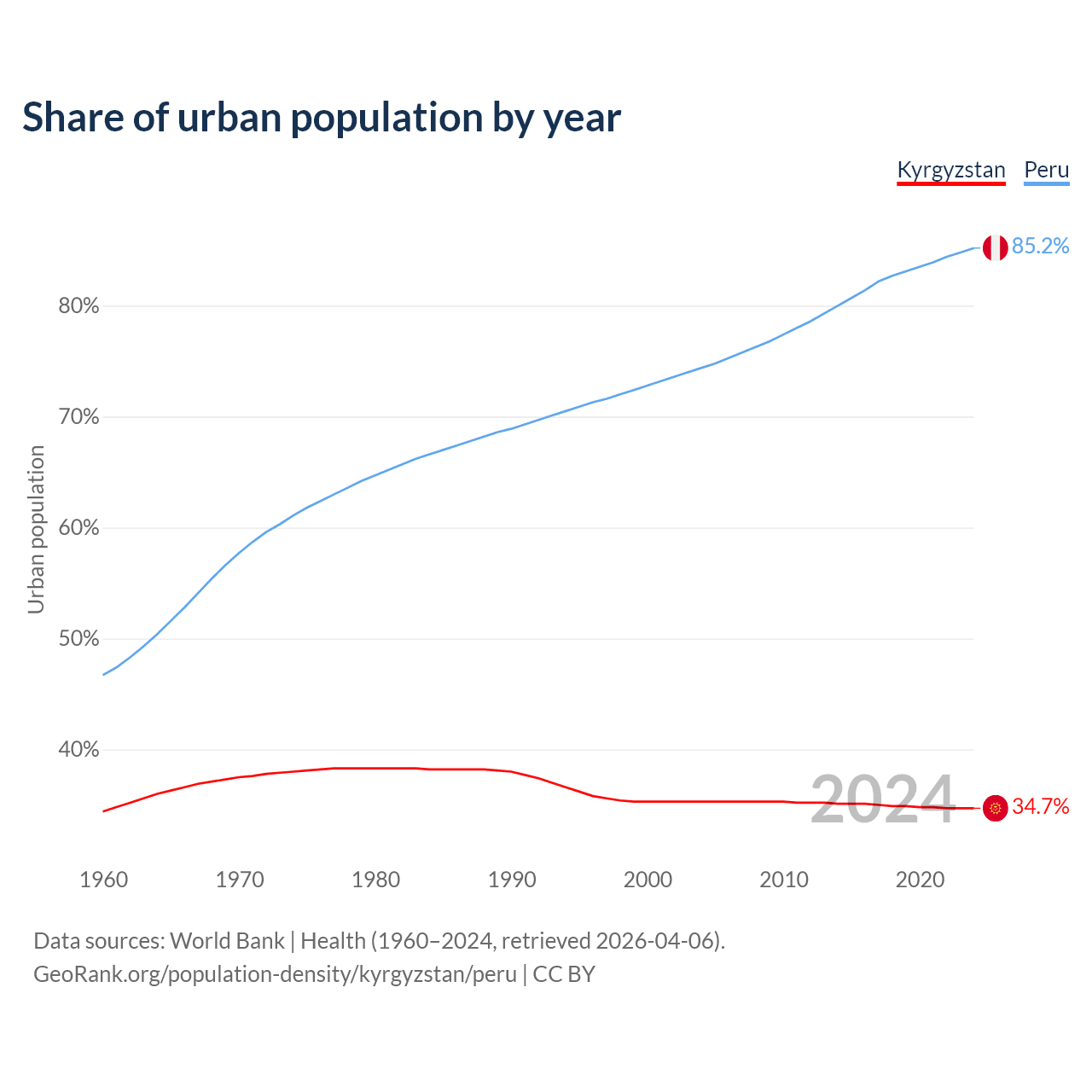 From 2004 to 2024, the share of urban population changed from 35.3% to 34.7% in Kyrgyzstan and from 74.4% to 85.2% in Peru.