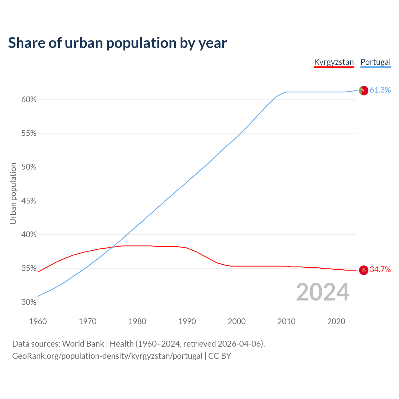 From 2004 to 2024, the share of urban population changed from 35.3% to 34.7% in Kyrgyzstan and from 57.4% to 61.3% in Portugal.