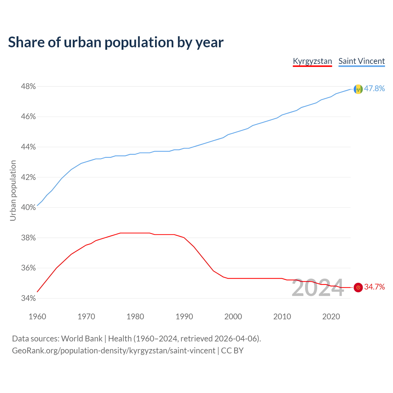 From 2004 to 2024, the share of urban population changed from 35.3% to 34.7% in Kyrgyzstan and from 45.4% to 47.8% in Saint Vincent.