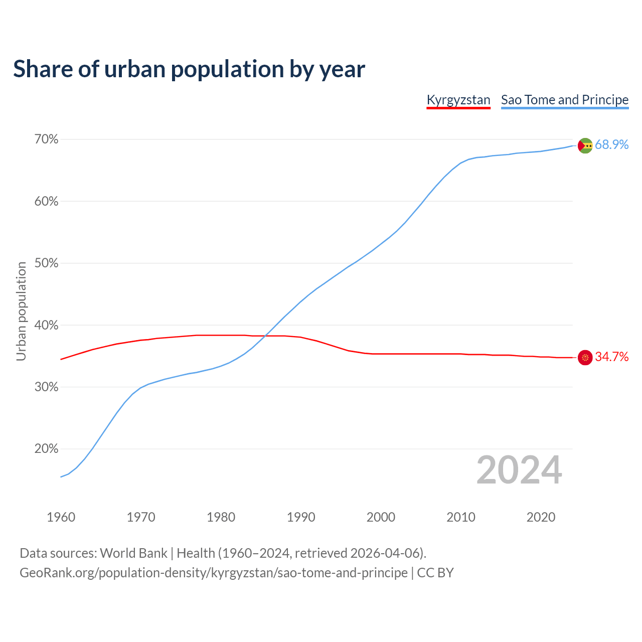 From 2004 to 2024, the share of urban population changed from 35.3% to 34.7% in Kyrgyzstan and from 57.9% to 68.9% in Sao Tome and Principe.